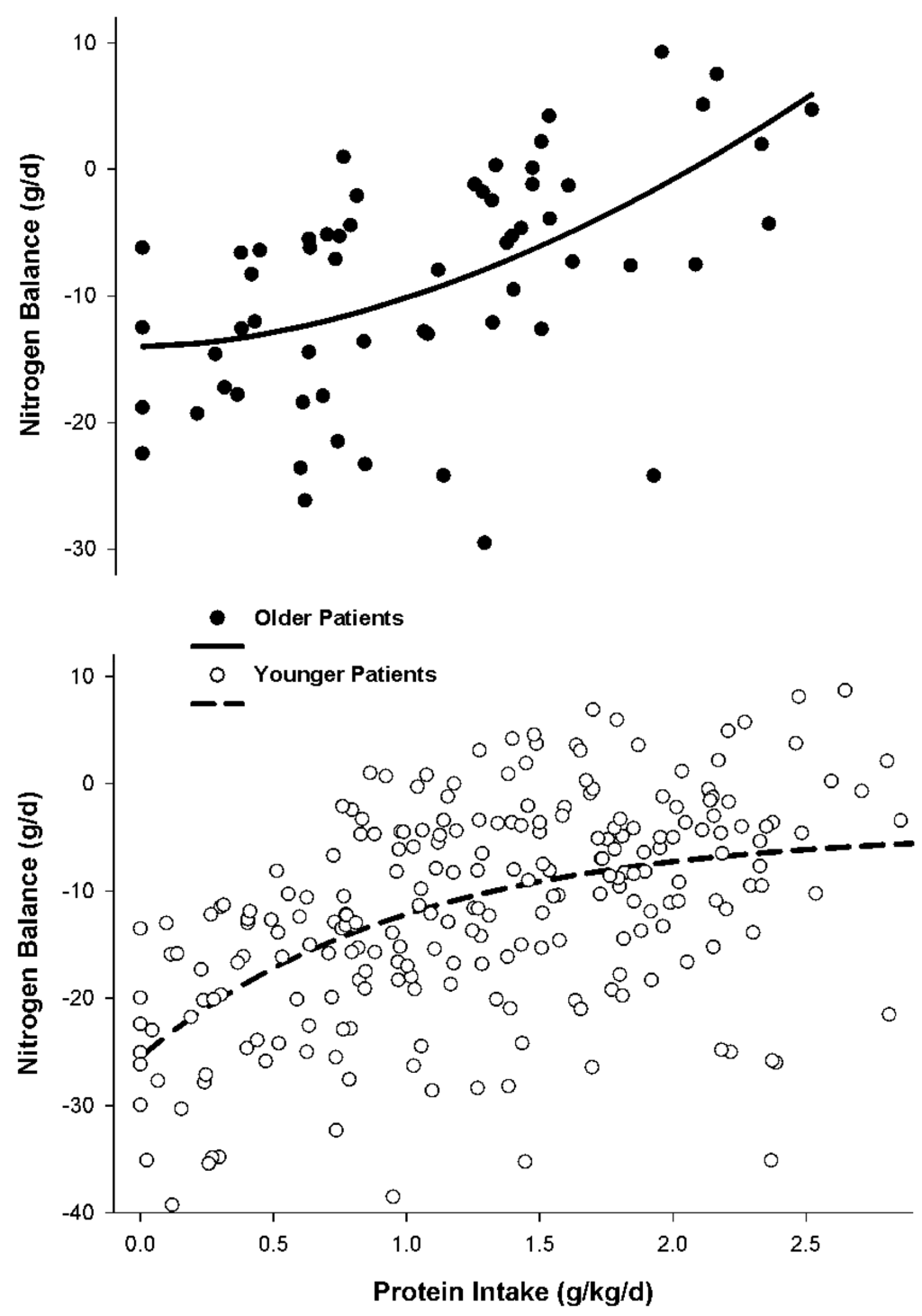 The data indicated considerable variability in nitrogen balance response to varying protein intakes among both older and younger patient groups. It was evident that a blunted improvement in nitrogen accretion in response to lower protein intakes occurred in older patients when compared to younger patients during critical illness (Figure 2). Older patients exhibited a concave relationship between protein intake and nitrogen balance response. Minimal change in nitrogen balance occurred at protein intakes less than 1.5 g/kg/day for older patients. However, when protein intakes of 1.5 to 2.5 g/kg/day were given, nitrogen accretion significantly improved (Figure 2). Conversely, in younger patients, a convex relationship between protein intake and nitrogen balance was demonstrated. Progressive improvement in nitrogen accretion occurred as protein intake increased until a protein intake of ~1.7 g/kg/day to 2.2 g/kg/day was achieved whereby higher doses resulted in only minor incremental improvements in nitrogen balance (Figure 2).