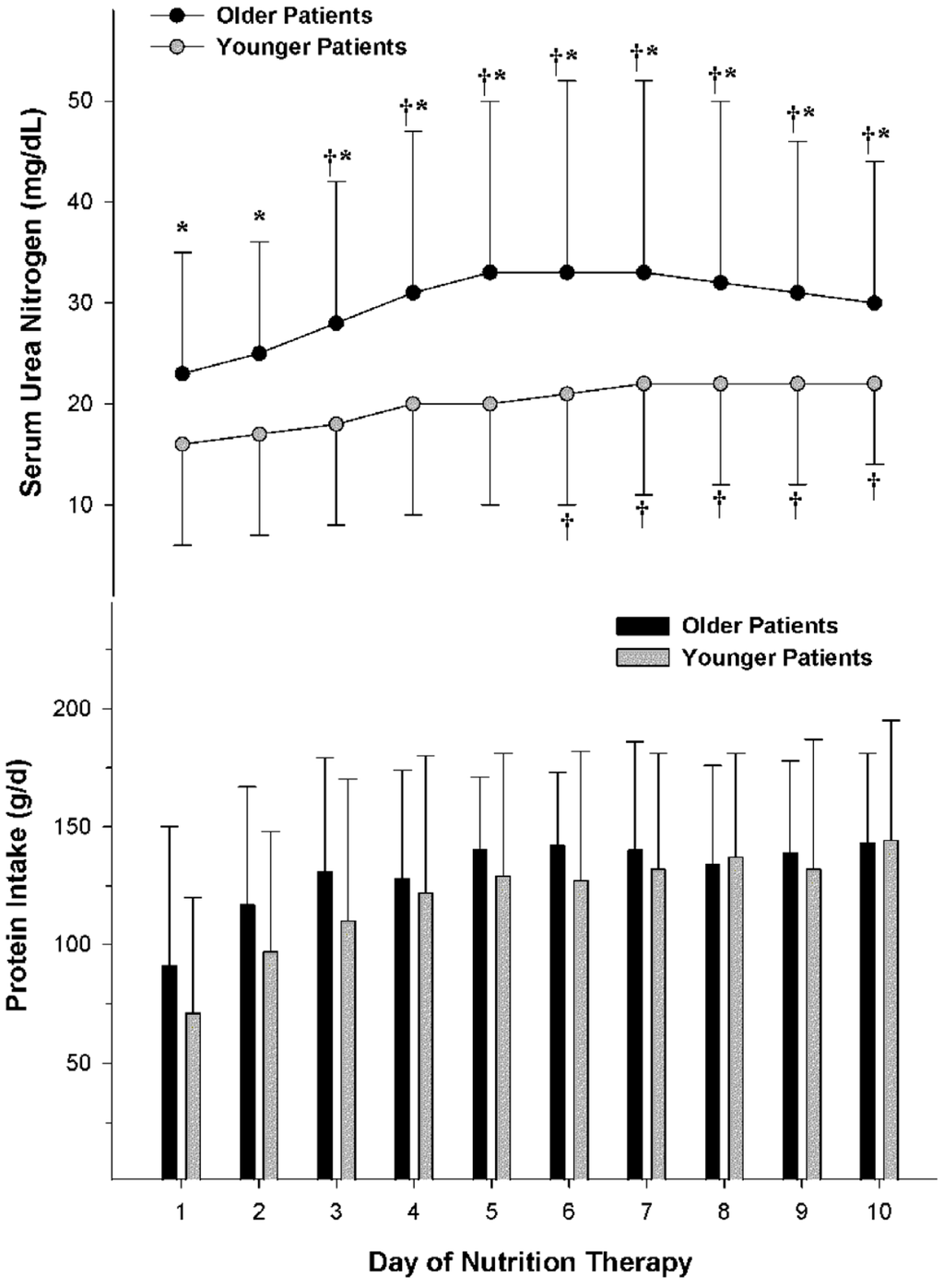 Serum urea nitrogen concentrations and protein intake during hypocaloric, high protein nutrition therapy in older vs. younger critically ill patients with obesity and traumatic injuries. Serial serum urea nitrogen concentrations were greater for older compared to younger patients (p = 0.001) despite isonitrogenous daily intakes between age groups. * p = 0.05 between age groups; † p = 0.05 from day 1. Reprinted with permission from Dickerson, R.N.; Medling, T.L.; Smith, A.C.; Maish, G.O., 3rd; Croce, M.A.; Minard, G.; Brown, R.O. Hypocaloric, high-protein nutrition therapy in older vs. younger critically ill patients with obesity. JPEN J. Parenter. Enter. Nutr. 2013, 37, 342–351. A.S.P.E.N. does not endorse the use of this material in any form other than its entirety.