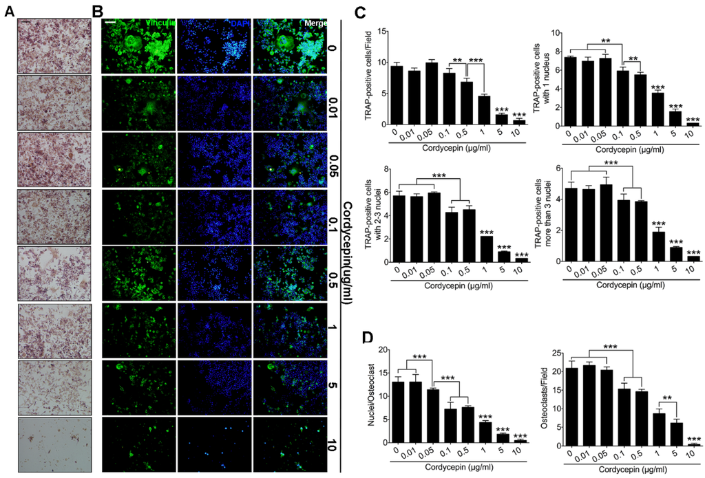 Primary BMMs were incubated in 96-well plate (5 × 103 cells/well) and induced for 72 h with cordycepin treatments. Procedures were described in previous study [30]. In brief, on Day 4, cells were washed and fixed for permeabilization. After blocking, primary antibody (Anti-Vinculin) was then diluted to a working concentration (1:300) in blocking solution, and cells were incubated for 1 h at room temperature. Secondary antibody (Alexa Fluor 488 Goat Anti-Mouse IgG (H + L) Antibody, Invitrogen) (1:500) and TRITC conjugated Phalloidin (1:500) was diluted in 1× PBS and cells were incubated for 1 h at room temperature. Nuclei counterstaining was performed by DAPI (1:1000) for 5 min followed by fluorescence microscopy observation.
