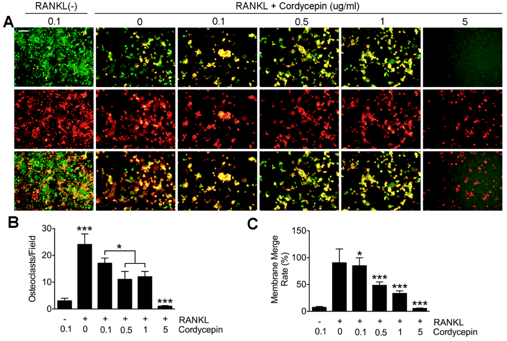 Cordycepin inhibits RANKL-induced osteoclast fusion in a dose-dependent way. Cells were labeled with either membrane dye DiI (red color) or cell content marker Cell tracker (green color) and then mixed together for fusing process. (A) Representative images of fusion assay. Primary BMMs treated without RANKL, M-CSF and cordycepin were set as blank control group. Five different groups were set according to different concentrations of cordycepin treatment (0 μg/mL, 0.1 μg/mL, 0.5 μg/mL, 1 μg/mL, and 5 μg/mL). (B) Quantification of osteoclasts (nuclei ≥ 3) in each field. (C) Membrane merge rate of osteoclasts in each field. Scale bar represents 40 μm. Data in the figures represent average ± SD. * p < 0.05, *** p < 0.001 based on one way ANOVA.