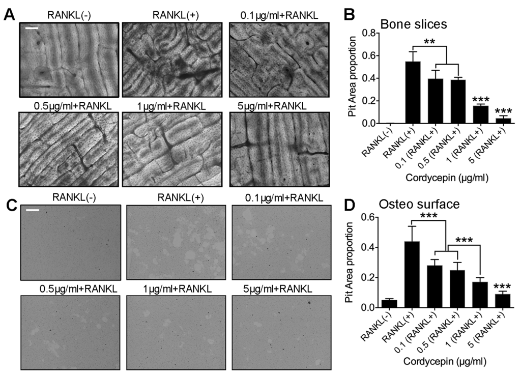 Primary BMMs were incubated in 96-well plates (Corning Osteo Assay Surface), 2 × 103 cells/well. Primary BMMs were incubated in 48-well plates covered with bovine bone slices, 1 × 104 cells/well. Cells were induced with RANKL (50 ng/mL) and M-CSF (50 ng/mL) for 96 h with different concentration of cordycepin treatments. Methylene blue stain was performed to evaluate the resorption area on bone slices. Bleach solution was added to 96-well osteo surface plates to remove cells. Detailed analysis of pit formation area was described in our previous study [30].