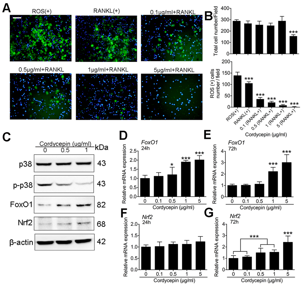 Cordycepin scavenges ROS generation and activates FoxO1 and Nrf2 expression. (A) Representative images of ROS positive BMMs during RANKL induced osteoclastogenesis treated with different concentrations of cordycepin (0 μg/mL, 0.1 μg/mL, 0.5 μg/mL, 1 μg/mL, and 5 μg/mL). (B) Quantification of total cell number and ROS positive cell number in each field. (C) Representative Western blot images of p38, p-p38, FoxO1, Nrf2 and β-actin. For blotting of p38 and p-p38, cells were pretreated with different dosages of cordycepin for 24 h and then induced with RANKL and M-CSF for 15 min. For FoxO1 and Nrf2, cells were treated with different dosages of cordycepin for 72 h with RANKL and M-CSF. (D,E) Relative mRNA expression levels of FoxO1 at 24 h (D) and 72 h (E) during osteoclastogenesis. (F,G) Relative mRNA expression levels of Nrf2 at 24 h (F) and 72 h (G) during osteoclastogenesis. Scale bar represents 200 μm. Data in the figures represent average ± SD. * p < 0.05, *** p < 0.001 based on one way ANOVA.
