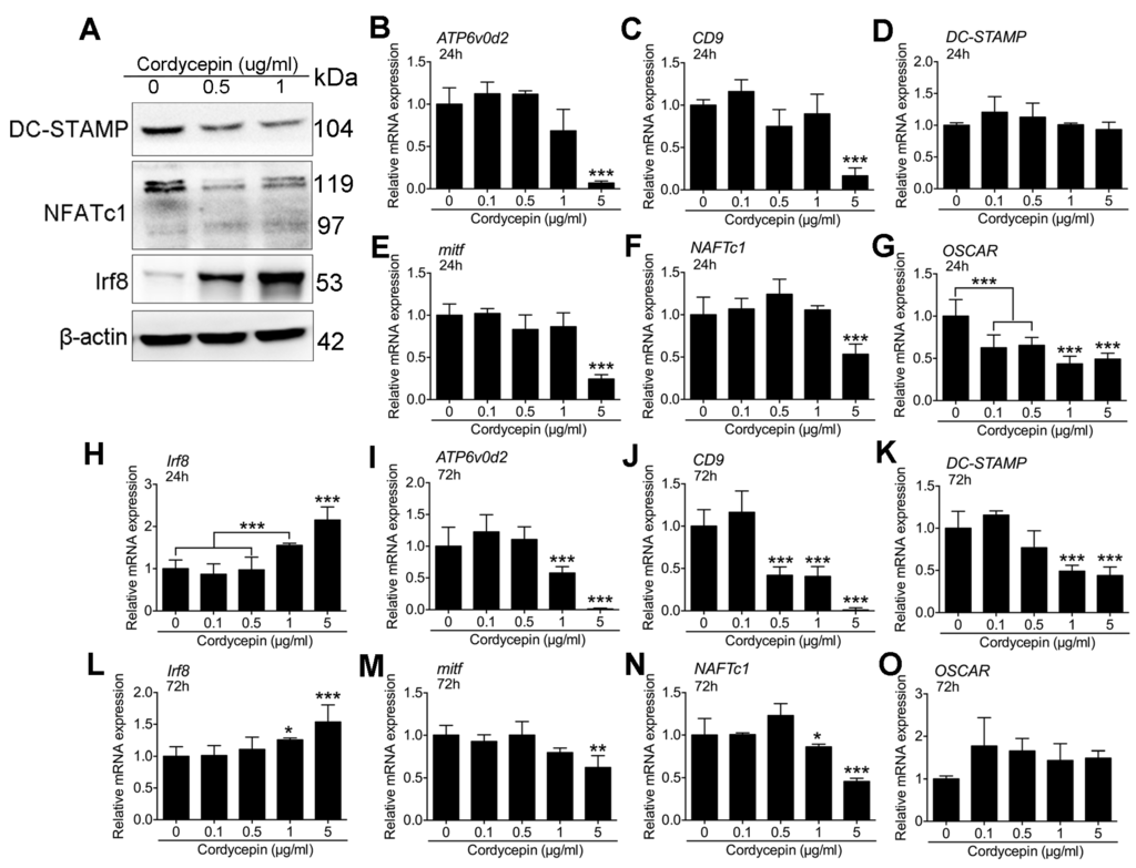 Cordycepin activates IRF-8 and suppresses NFATc1 expression during osteoclastogenesis. (A) Representative Western blot images of, DC-STAMP, NFATc1, IRF-8 and β-actin. Cells were treated with different dosages of cordycepin for 72 h with RANKL and M-CSF before protein extraction. (B–H) Relative mRNA expression levels of ATP6v0d2 (B); CD9 (C); DC-STAMP (D); mitf (E); NFATc1 (F); OSCAR (G); and IRF-8 (H) at 24 h during osteoclastogenesis. (I–O) Relative mRNA expression levels of ATP6v0d2 (i); CD9 (J); DC-STAMP (K); mitf (L); NFATc1 (M); OSCAR (N); and IRF-8 (O) at 72 h during osteoclastogenesis. Data in the figures represent average ± SD. * p < 0.05, ** p < 0.01, *** p < 0.001 based on one way ANOVA.
