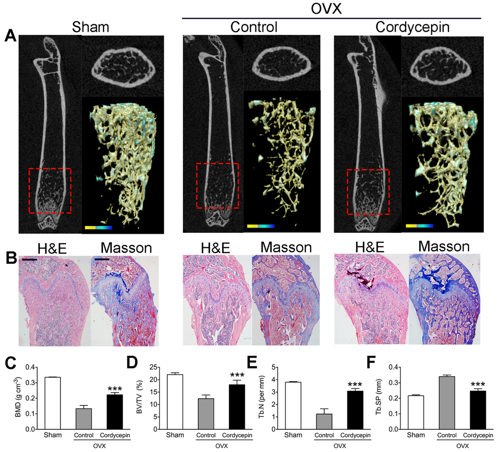 Cordycepin preventes bone loss in ovariectomized (OVX) mice: (A) Representative microCT longitudinal section images of femurs, cross-sectional view of the distal femurs and reconstructed trabecular structure of the region of interest (red dashed box). Color scale bar represents bone mineral density level. (B) Representative images of histological slides of H&E stain and Masson stain focusing on the metaphyseal region of the distal femur from mice of different groups. Scale bar represents 800 μm. (C–F) Quantitative microCT analysis of average femur length, distal femoral volumetric bone mineral density (BMD), trabecular bone volume fraction (BV/TV), trabecular number (Tb. N) and trabecular separation (Tb. Sp) in each group. Data in the figures represent average ± SD (n = 3). *** p < 0.001 (vs. Control) based on one way ANOVA.