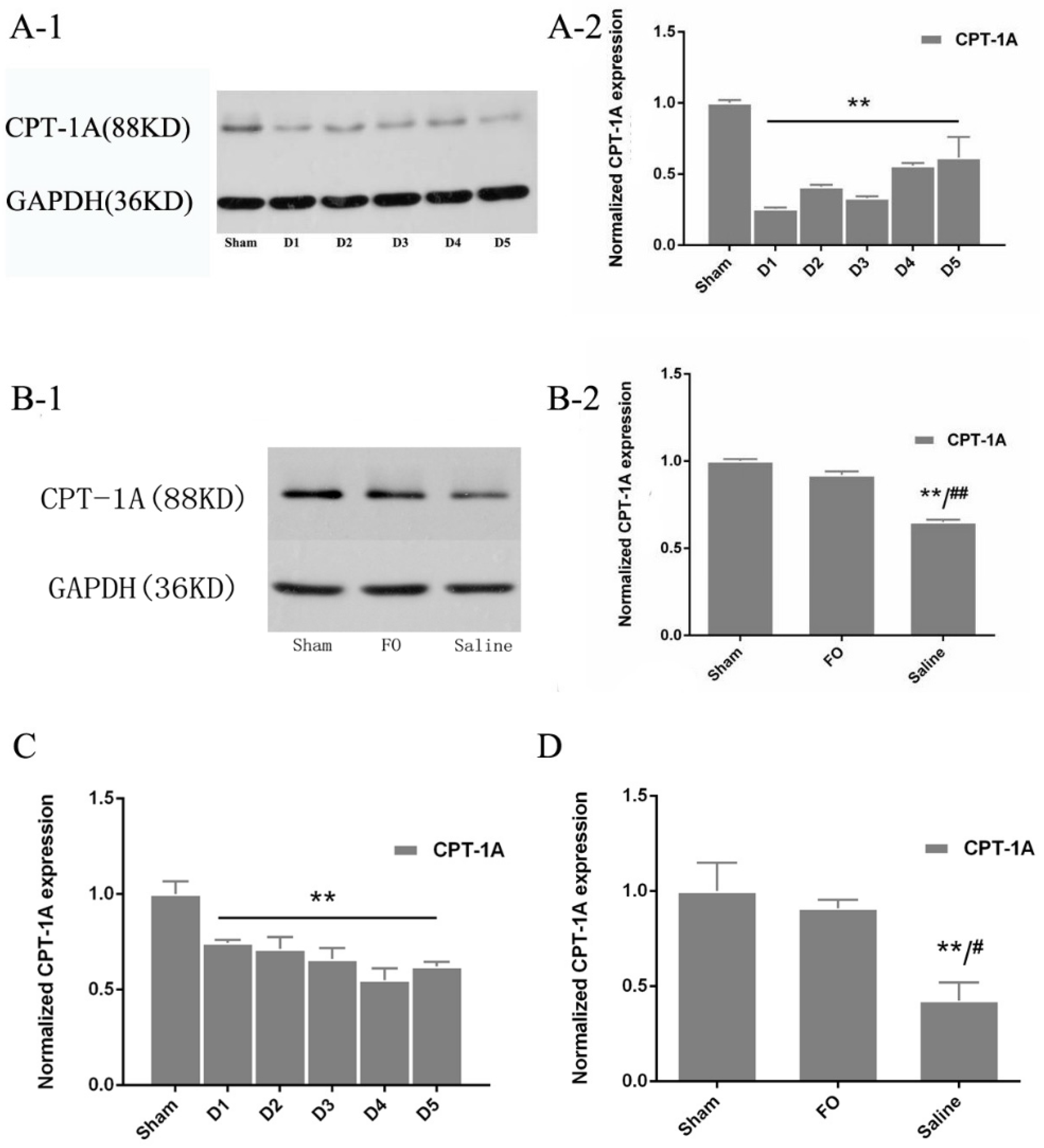Western blot analysis and qPCR analysis of CPT-1A expression: (A-1) Western blots of CPT-1A in the Part 1 experiment; (A-2) the relative expression of CPT-1A protein was quantified and normalized to that of GAPDH protein; (B-1) Western blots of CPT-1A in the Part 2 experiment; (B-2) the relative expression of CPT-1A protein was quantified and normalized to that of GAPDH protein; (C) the relative expression of CPT-1A was normalized to that of 36B4 in the Part 1 experiment; and (D) the relative expression of CPT-1A was normalized to that of 36B4 in the Part 2 experiment. * p < 0.05 compared to the sham group; ** p < 0.01 compared to the sham group; # p < 0.05 compared to the FO group. Error bars indicate standard deviations. D1–D5 indicate days after operation in the experimental groups.