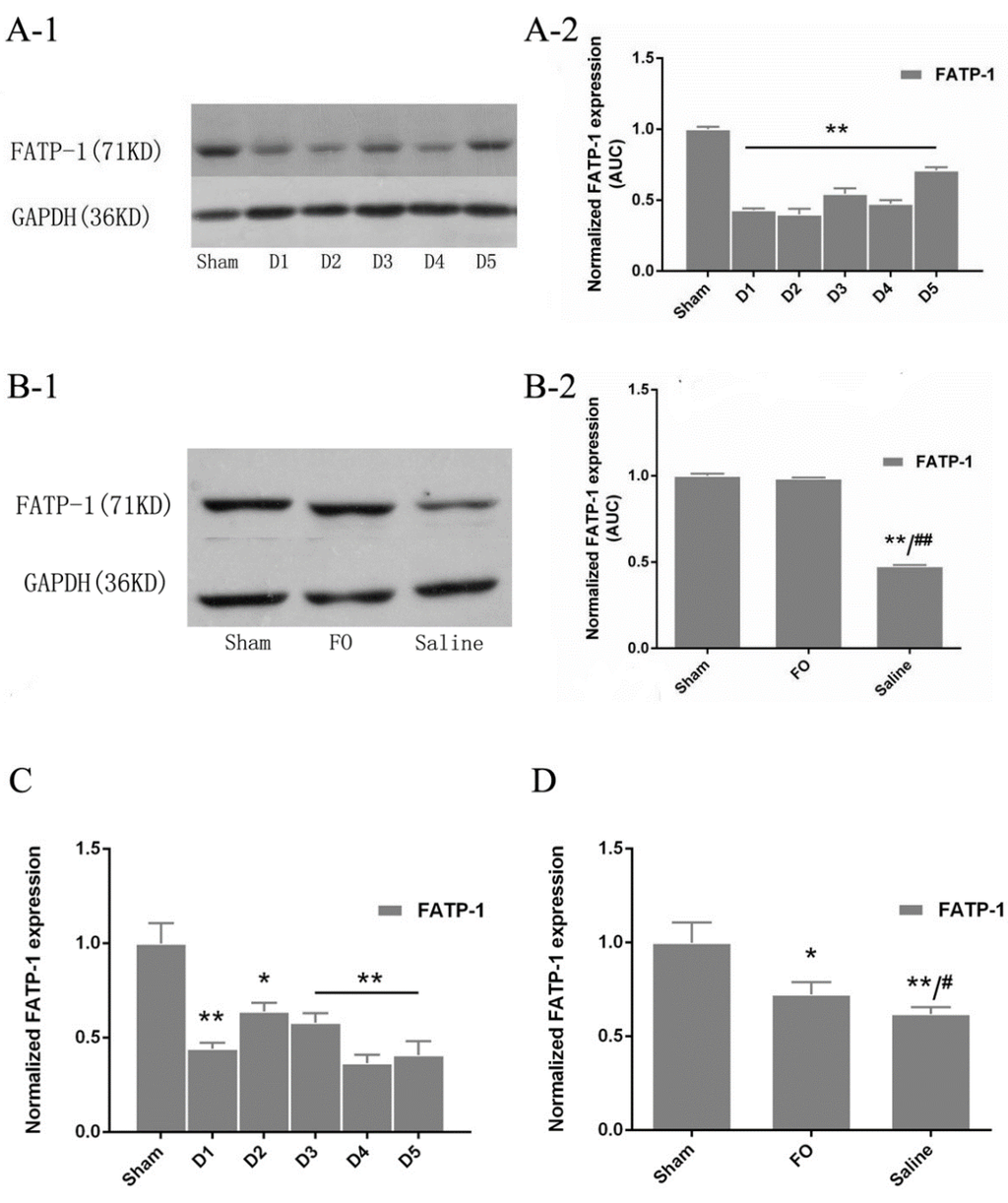 Western blot analysis and qPCR analysis of FATP-1 expression: (A-1) Western blots of FATP-1 in the Part 1 experiment; (A-2) the relative expression of FATP-1 protein was quantified and normalized to that of GAPDH protein; (B-1) Western blots of FATP-1 in the Part 2 experiment; (B-2) the relative expression of FATP-1 protein was quantified and normalized to that of GAPDH protein; (C) the relative expression of FATP-1 was normalized to that of 36B4 in the Part 1 experiment; and (D) the relative expression of FATP-1 was normalized to that of 36B4 in the Part 2 experiment. * p < 0.05 compared to the sham group; ** p < 0.01 compared to the sham group; # p < 0.05 compared to the FO group. Error bars indicate standard deviations. D1–D5 indicate days after operation in the experimental groups.