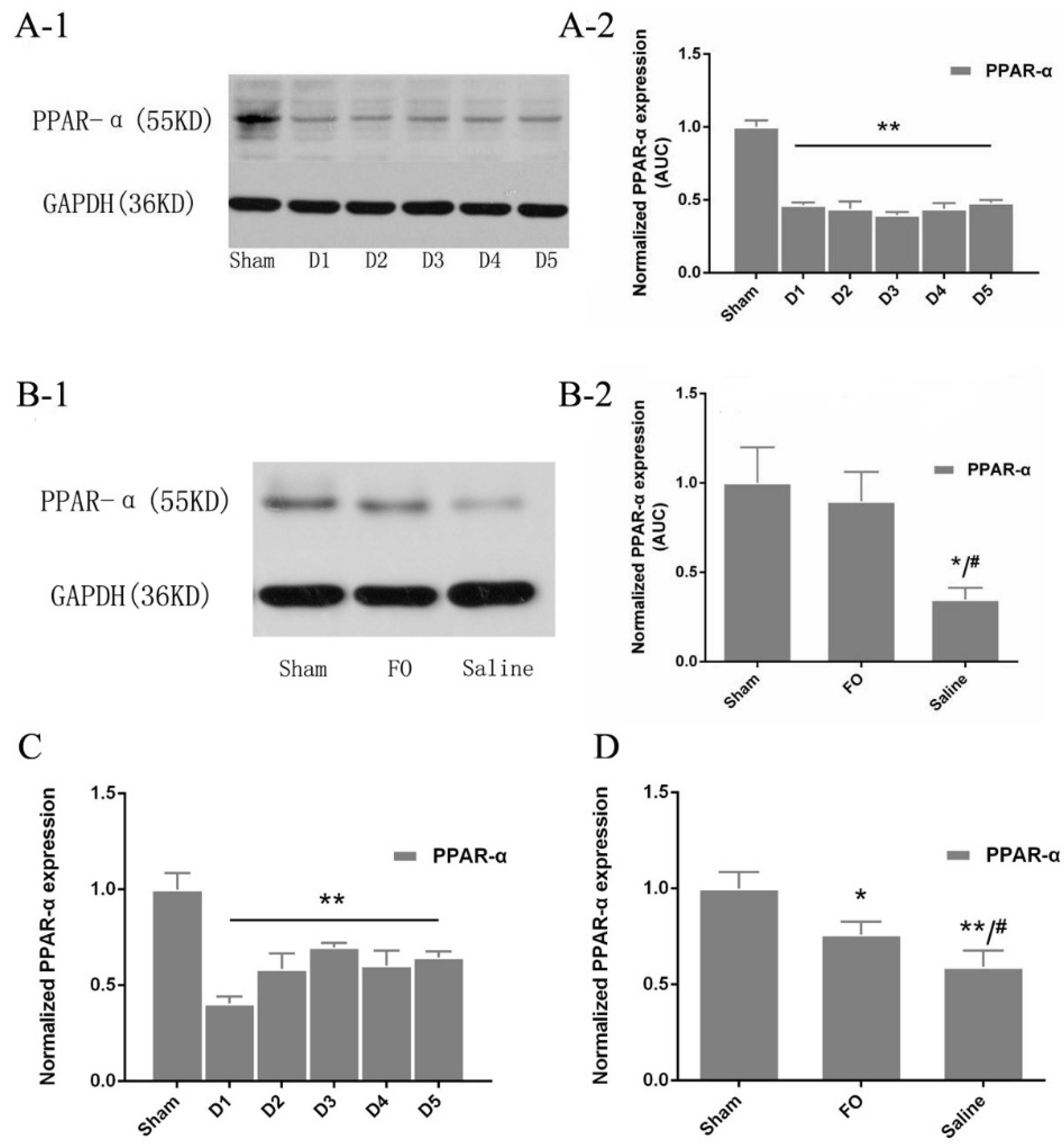 Western blot analysis and q-PCR analysis of PPAR-α expression: (A-1) Western blots of PPAR-α in the Part 1 experiment; (A-2) the relative expression of PPAR-α protein was quantified and normalized to that of GAPDH protein; (B-1) Western blots of PPAR-α in the Part 2 experiment; (B-2) the relative expression of PPAR-α protein was quantified and normalized to that of GAPDH protein; (C) the relative expression of PPAR-α expression was normalized to that of 36B4 in the Part 1 experiment; and (D) the relative expression of PPAR-α expression was normalized to that of 36B4 in the Part 2 experiment. * p < 0.05 compared to the sham group; ** p < 0.01 compared to the sham group; # p < 0.05 compared to the FO group. Error bars indicate standard deviations. D1–D5 indicate days after operation in the experimental groups.