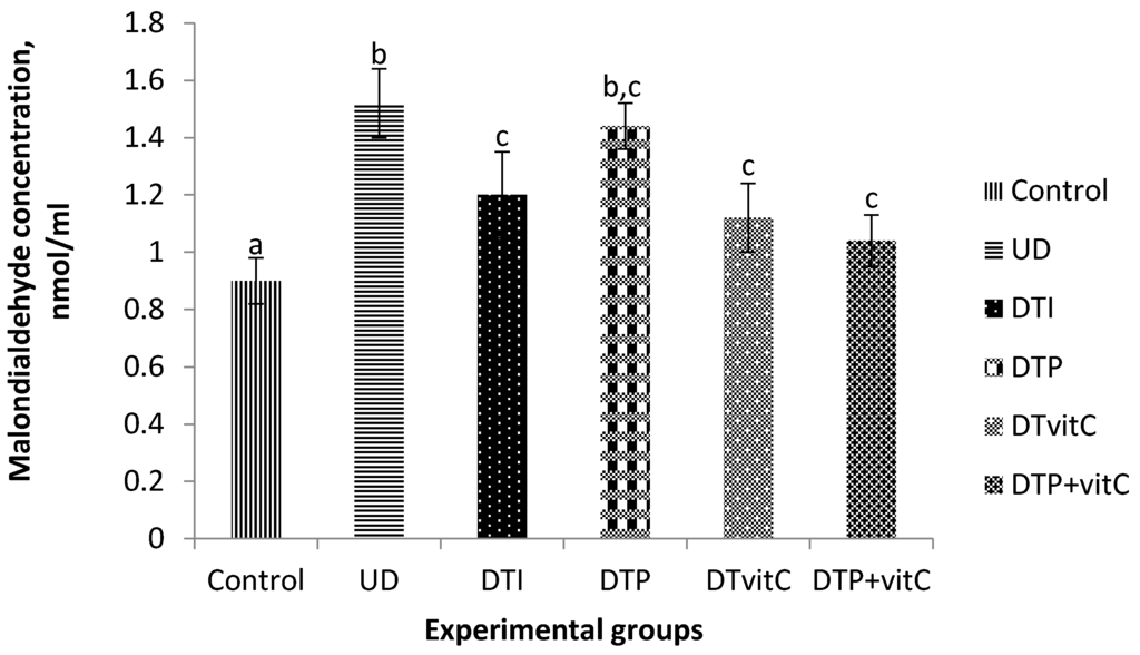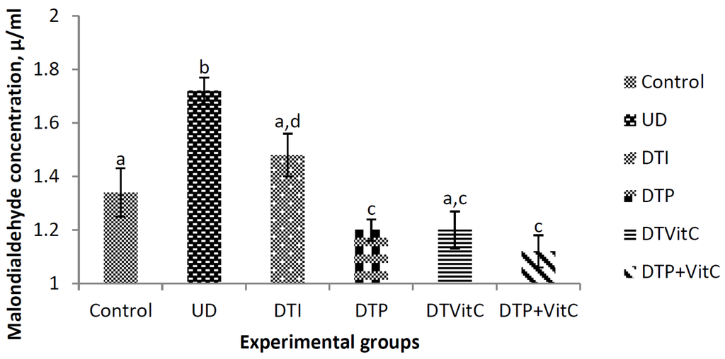 Effects of treatment with insulin, probiotic and vitamin C on serum MDA concentration in alloxan-induced diabetic rats. Abbreviations: UD, untreated diabetic; DTI, diabetic + treated with insulin; DTP, diabetic + treated with probiotic; DTVit-C, diabetic + treated with vitamin C; DTP + Vit-C, diabetic + treated with probiotic and vitamin C. The values are expressed as mean ± S.E. (n = 5). Values with superscript letters are significantly (p < 0.01) different.
