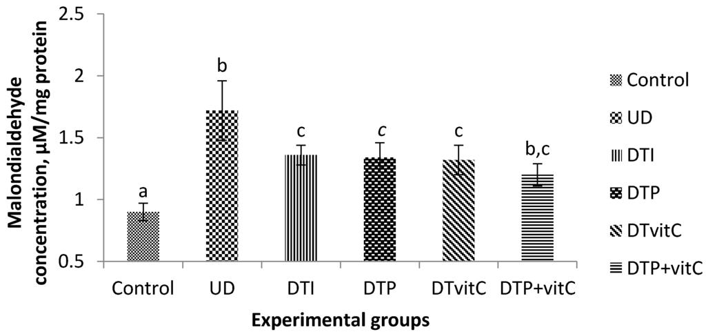 Effects of treatment with insulin, probiotic and vitamin C on kidney malondialdehyde concentrations of alloxan-induced diabetic rats. Abbreviations: UD, untreated diabetic; DTI, diabetic + treated with insulin; DTP, diabetic + treated with probiotic; DTVit-C, diabetic + treated with vitamin C; DTP + Vit-C, diabetic + treated with probiotic and vitamin C. The values are expressed as mean ± S.E. (n = 5). Values with different superscript letters are significantly (p < 0.05) different.