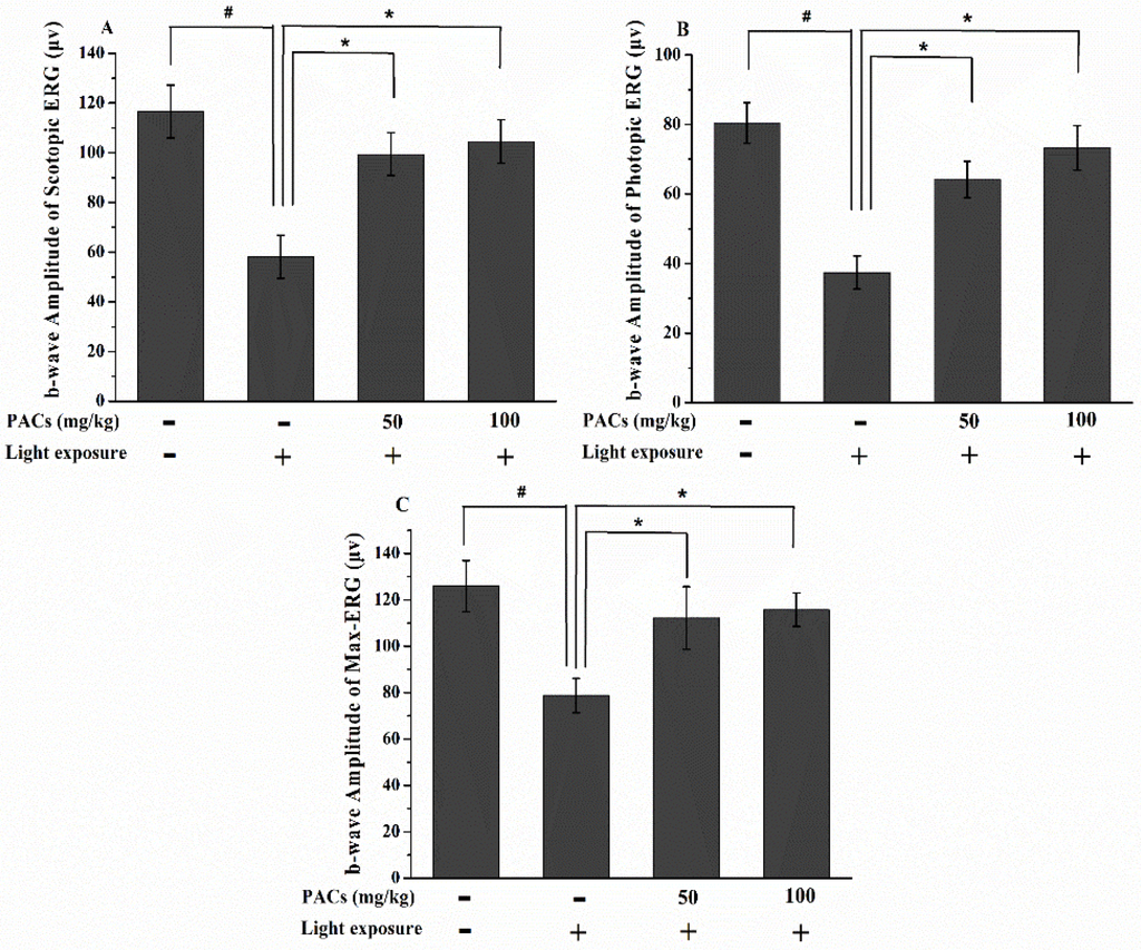 b-Wave amplitudes of (A) scotopic electroretinogram (ERG), (B) photopic ERG and (C) max-ERG from retinas in rabbits in the control group (CG), model group (MG), low dosage proanthocyanidins (LPACs) and high dosage PACs (HPACs) groups 7 days after light exposure. Data are expressed as the mean ± standard deviation (n = 8). (#, ∗) p < 0.05 (one-way ANOVA followed by Tukey’s test). CG: no light exposure and vehicle administration; MG: 18,000 lx light exposure and vehicle administration; LPACs: 18,000 lx light exposure and administration of low-dosage sea buckthorn seed PACs (50 mg/kg); HPACs: 18,000 lx light exposure and administration of high-dosage sea buckthorn seed PACs (100 mg/kg).