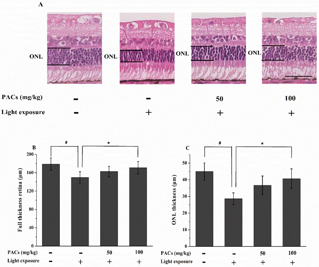 Effect of sea buckthorn seed PACs on the full thickness retina and outer nuclear layer (ONL) thickness in rabbits 7 d after light exposure (18,000 lx). (A) Representative images of the HE-stained sections of rabbit retinas. Scale bar: 50 μm. (B, C) The full thickness retina and ONL thicknesses were measured within 250–2750 μm (counted at 500 μm intervals) of the superior and inferior edges from the ONH based on photographs of HE-stained sections by personnel blinded to the study groups. The full thickness retina and ONL thicknesses were calculated from 12 sections for each retina. Data are expressed as the mean ± standard deviation (n = 8). (#, ∗) p < 0.05 (one-way ANOVA followed by Tukey’s test).