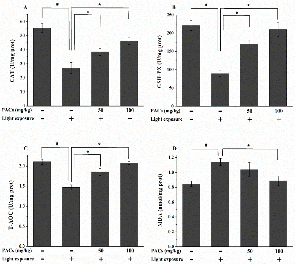 Changes in (A) CAT and (B) GSH-Px activities, as well as (C) total antioxidant capacity (T-AOC) and (D) malondialdehyde (MDA) levels, in the retina 7 d after light exposure (18,000 lx). Data are expressed as the mean ± standard deviation (n = 8). (#, ∗) p < 0.05 (one-way ANOVA followed by Tukey’s test). CAT: catalase; GSH-Px: glutathione peroxidase; T-AOC: total antioxidant capacity; MDA: malondialdehyde.