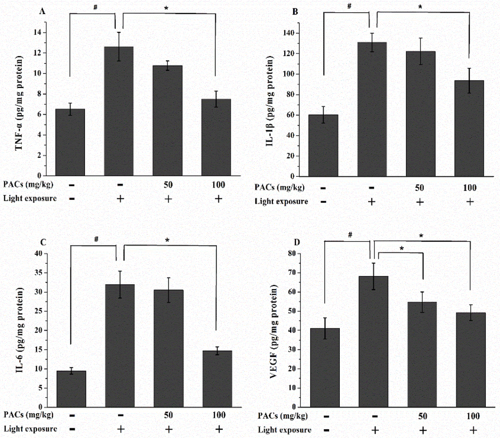 Evidence has been presented that TNF-α, IL-1β and IL-6 play an important role in the regulation of inflammatory responses, and those cytokines elevation is associated with many inflammatory disorders [56]. Proangiogenic factors have been shown to be involved in the development of AMD, with VEGF playing the most important role of neovascularization and increasing permeability [57]. NF-κB plays a major role in the regulation of a wide range of genes (TNF-α, IL-1β and IL-6) that are involved in the underlying inflammatory diseases [58]. Epidemiological studies have indicated that populations that consume proanthocyanidin-rich foods have lower incidences of inflammatory diseases [59]. PACs exert potent anti-inflammatory activity through the inhibition of TNF-α, IL-1β, iNOS and COX-2 by regulating the NF-κB and p38 MAPK pathway [60,61]. In this study, sea buckthorn seed PACs decrease the levels of TNF-α, IL-1β and IL-6 in retina of rabbits exposed to visible light.