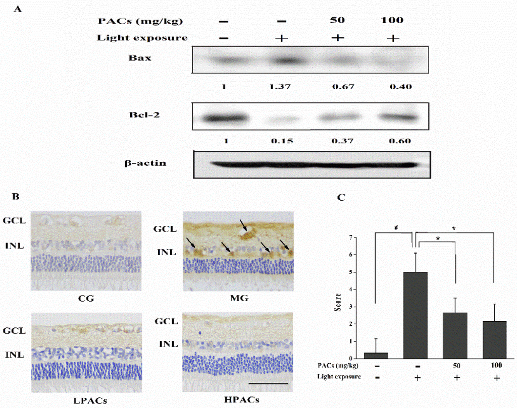 The expression of apoptotic proteins was determined via Western blot analysis or immunohistochemistry. Light exposure upregulated the pro-apoptotic protein Bax and downregulated the anti-apoptotic protein Bcl-2 (Figure 5A). Sea buckthorn seed PACs increased the expression of the anti-apoptotic protein Bcl-2 and decreased the expression of Bax. Caspase-3 activity was not detectable in the CG rabbits (Figure 5B). The expression of active caspase-3 was high in the ganglion cell layer and inner nuclear layer of the rabbit retinas from the MG. However, treatment with sea buckthorn seed PACs reduced the level of active caspase-3 in both layers. The expression of active caspase-3 by immunohistochemistry was scored as shown in Figure 5C.