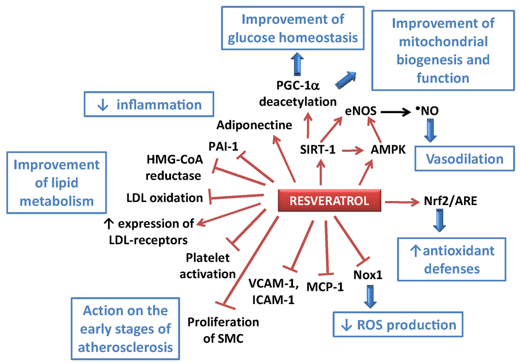 Some of the potential effects of resveratrol (RES) towards atherogenesis and impaired metabolism. AMPK: AMP-activated protein kinase; ARE: antioxidant response element; eNOS: endothelial NO synthase; HMG-CoA reductase: 3-hydroxy-3-methyl-glutaryl-CoA reductase; ICAM-1: intercellular adhesion molecule-1; LDL: low density lipoprotein; MCP-1: monocyte chemotactic protein-1; NF-κB: nuclear factor-kappa B; Nox1: NADPH oxidase 1; Nrf2: nuclear factor (erythroid-derived 2)-like 2; PAI-1: plasminogen activator inhibitor-1; PGC-1αperoxisome proliferator-activated receptor-γ co-activator 1α; ROS: reactive oxygen species; SIRT-1: silent information regulator 2/sirtuin 1; SMC: smooth muscle cells; VCAM-1: vascular cell adhesion molecule-1.