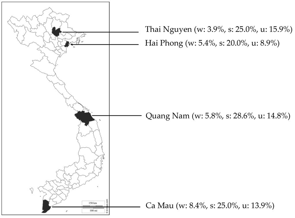 In consultation with NIN, four provinces were chosen from across the country based on the malnutrition rates among children under five years of age. The provinces selected were Hai Phong, Thai Nguyen in the North, Quang Nam in the center and Ca Mau in the South. Their geographical locations as well as respective malnutrition prevalence at baseline (i.e., in 2013) are detailed in the Figure 1 [18]. The provincial health department of each province proposed a list of districts and communes after local consultations determining their willingness to join the pilot project and on the accessibility of their health centers. To this end, supplies of Bibomix, along with educational and visibility materials, were distributed to 337 local health centers from July 2014 to December 2014. The distribution was entirely integrated within the health system, leveraging existing meetings and platforms to supply the health centers, going from province to district, district to commune, and finally commune to local health center.
