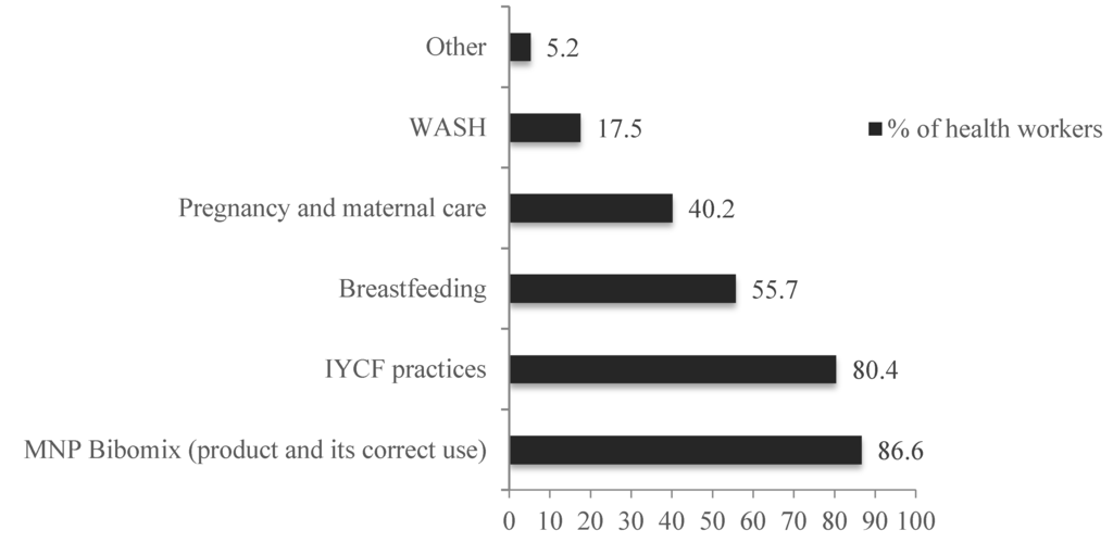 Health workers were questioned about the counseling topics they provided to the caregivers and had the possibility to give multiple responses. The main counselling topics provided to caregivers were on IYCF, MNP, and breastfeeding, as detailed in Figure 2, demonstrating that Bibomix was well integrated with the promotion of optimal IYCF practices.