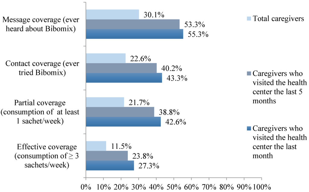 • Message coverage: percentage of caregivers who have ever heard of or seen Bibomix.