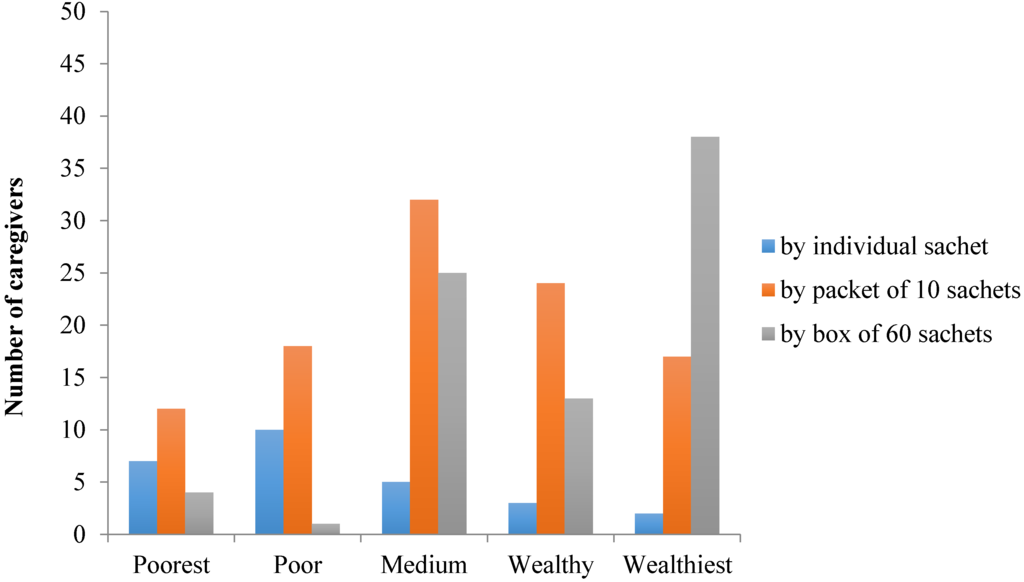 The purchase trends also showed that caregivers in Northern provinces preferred buying a full box of Bibomix, while in the center and southern provinces they purchased mainly the intermediate packet and primarily single sachets respectively. Wealth index varies significantly by provinces, as the majority of caregivers were from the medium to the wealthiest quintiles in the northern provinces, while in the center and southern there were mainly from the poorest to the medium quintiles. The number of sachets bought by the caregivers was positively correlated with the wealth index, demonstrating that the innovation in the packaging size, i.e., offering single sachets, packets of 10 sachets or boxes of 60 sachets, proved to be well suited to adapt to different purchasing powers. The different price points helped increase the product affordability and can be considered an important factor in driving trial of the MNP. As the coverage survey was conducted only five months after the start of the MNP sales at the health centers, repurchase trends by caregivers could not be assessed.