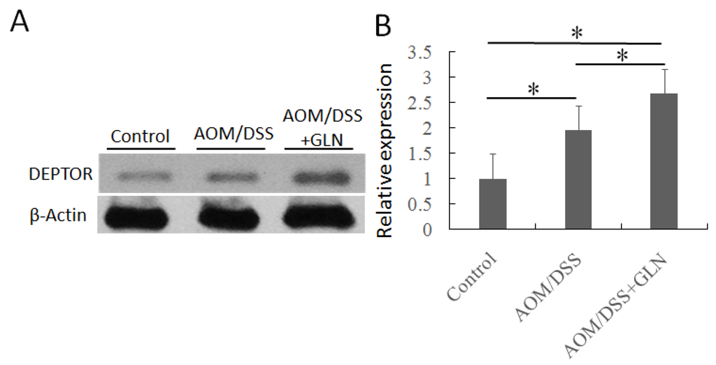 Changes in DEPTOR protein expression in the colon of mice. GLN significantly increased the protein expression in DSS/AOM mice with colitis-associated cancer (A). The expression of DEPTOR was statistically analyzed relative to β-actin expression by densitometry (B). Data are expressed as the means ± SD, * p < 0.05.