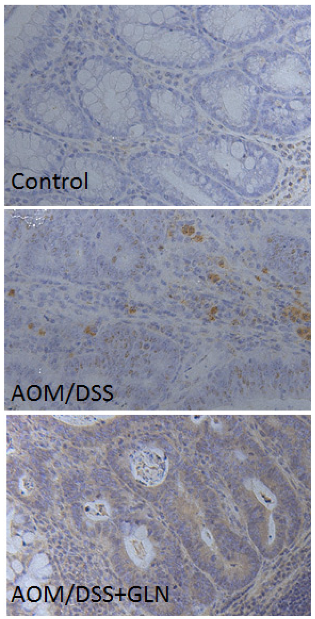 We first evaluated the impact of GLN administration on the expression of DEPTOR. Western blotting revealed that GLN-treated AOM/DSS mice exhibited increased DEPTOR expression compared with untreated AOM/DSS mice (Figure 1). Increased DEPTOR expression was also confirmed by the immunochemical study, which revealed increased DEPTOR expression in AOM/DSS mice treated with GLN (Figure 2).