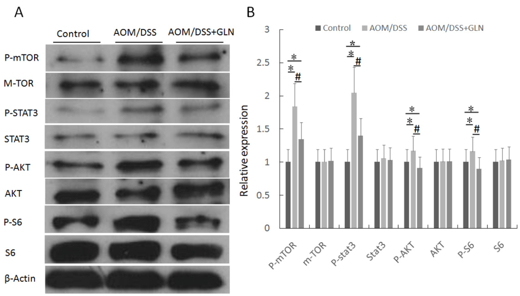 GLN suppresses m-TOR signaling pathway in vivo. Western blot analysis of P-mTOR, mTOR, P-STAT3, STAT3, P-AKT, AKT, P-S6, and S6 in AOM/DSS mice treated with or without GLN (A); and the expressions were statistically analyzed relative to β-actin expression by densitometry (B). Data are expressed as the means ± SD, * p < 0.05 vs. control group, # p < 0.05 vs. AOM/DSS group.
