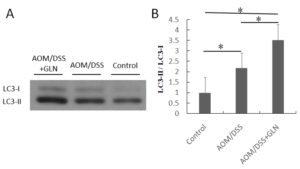 Effects of GLN on autophagy. Increased expression of LC3-II protein by GLN in AOM/DSS treated mice (A); The ratio of LC3-II/LC3-I proteins was statistically analyzed by densitometry (B). Data are presented as means ± SD. * Statistical differences with p < 0.05.