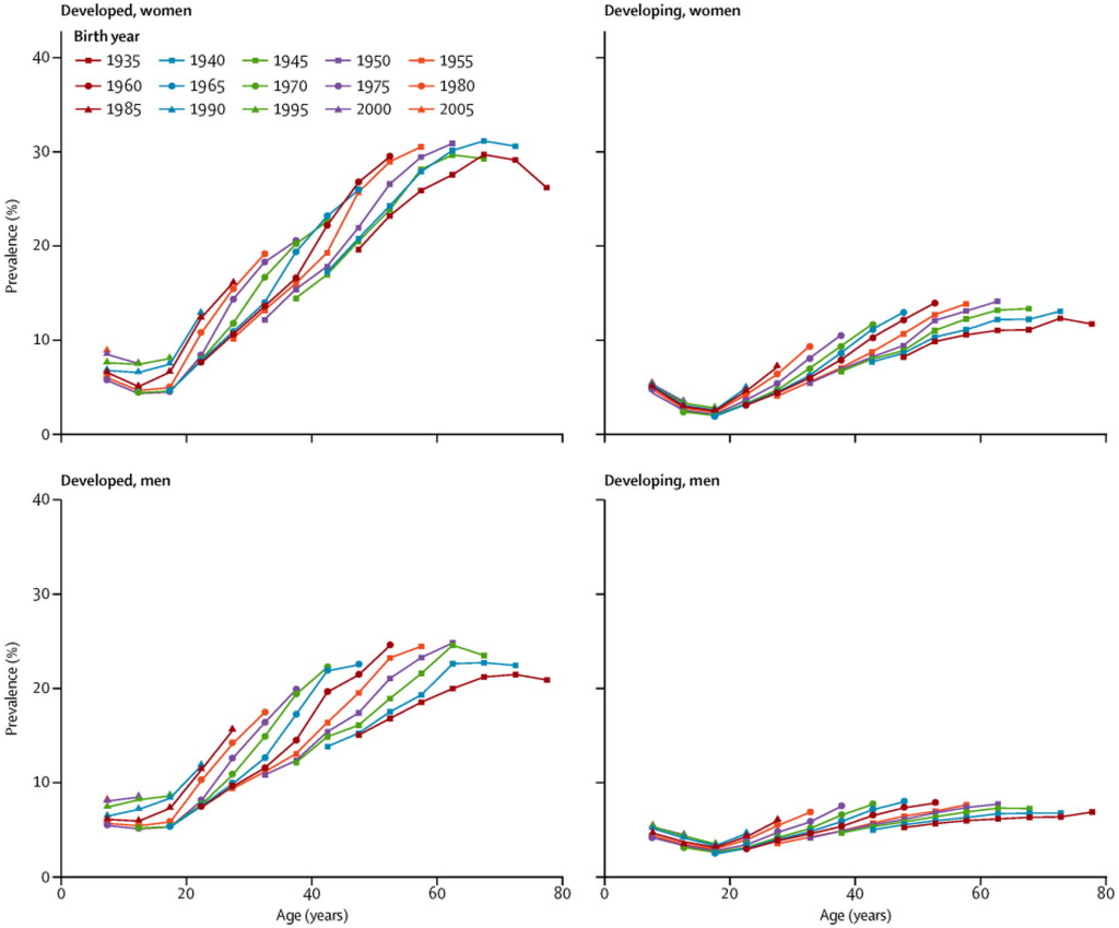 Obesity prevalence for women and men in developed and developing countries presented by age across birth cohorts *. * Findings from the Global Burden of Disease Study 2013 [], reprinted with permission.