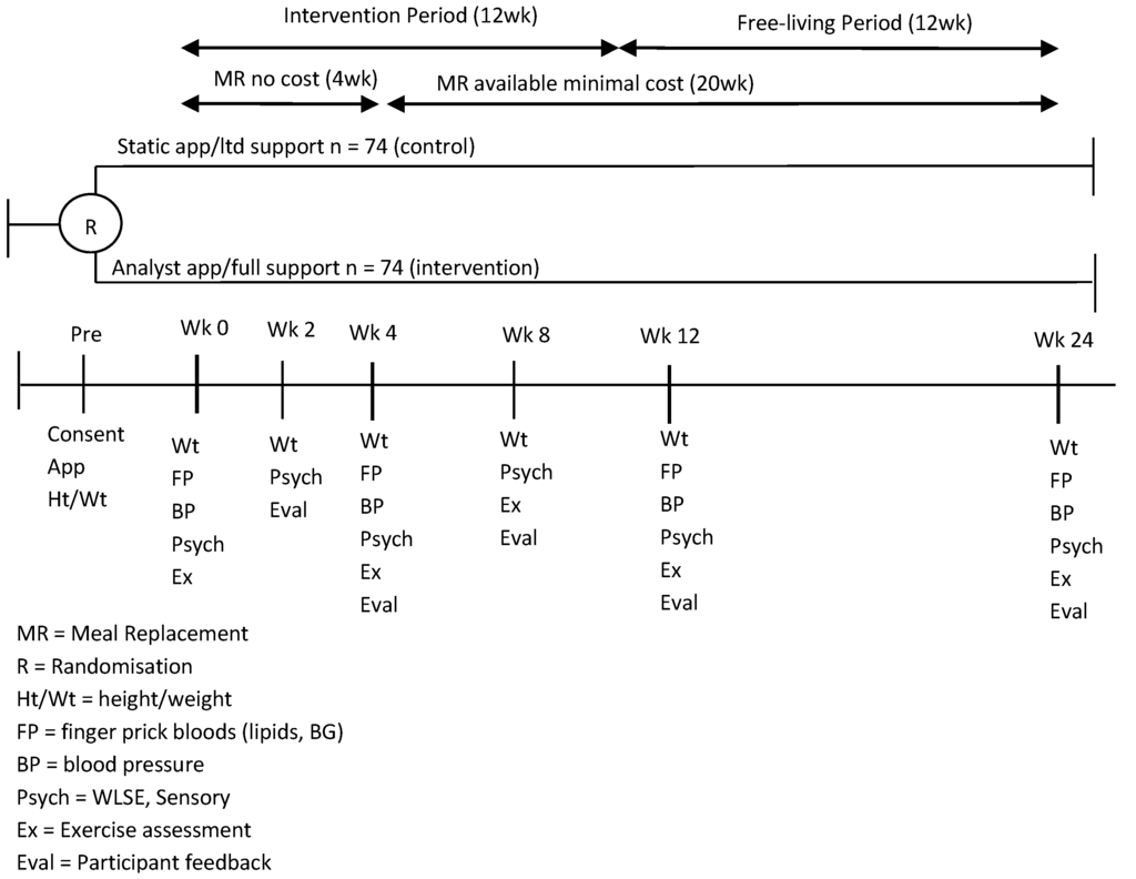 The study included an active intervention period (12 weeks) followed by a 12-week free living period. During the intervention period, MRs were provided for the first 4 weeks, volunteers were required to purchase them at a nominal cost (1AUD per sachet) for the remainder of the study. This was done to improve the external validity of the results, as our objective was to evaluate not only observational changes in measures, but also the feasibility and acceptability of the program as a whole, which would ultimately involve provision of a product that would require the user to purchase it.