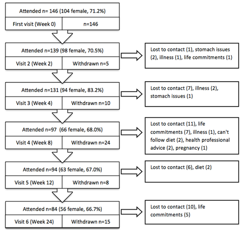 At the end of the study, there was no difference in drop-out between the two app groups (χ2(1, 145) = 0.96, p = 0.547). By Week 24, 57.5% of participants remained in the study (Figure 2). The large drop-out (n = 24) between weeks 4 and 8 corresponded with the cessation of the provision of free meal replacements. A majority of drop-outs were lost to contact with no reason provided (n = 35, 56.5%). A small portion (n = 7; 11.3%) identified gastrointestinal issues or difficultly with the diet as the reason for withdrawal.