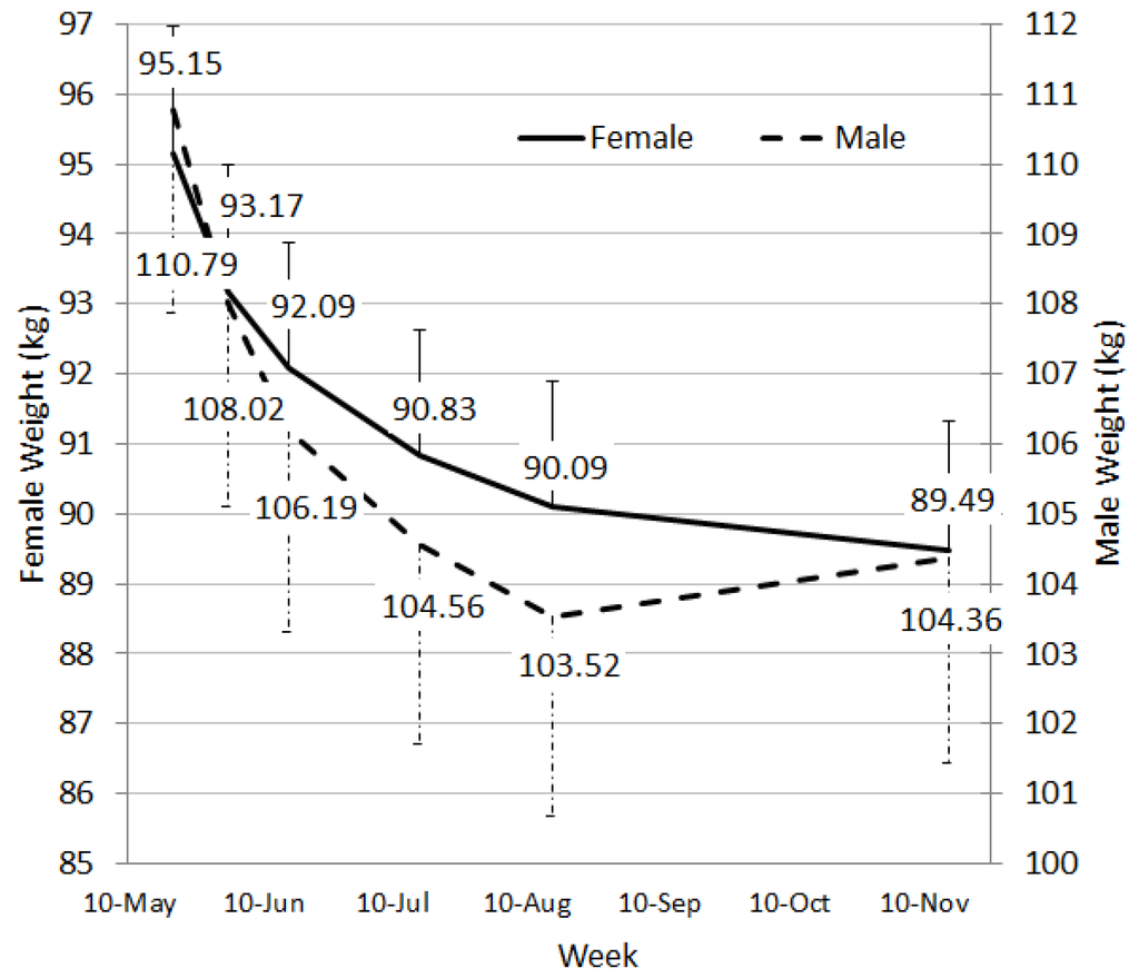 Adjusted weight loss values (kilograms) through the trial period. Error bars represent 1 standard error.