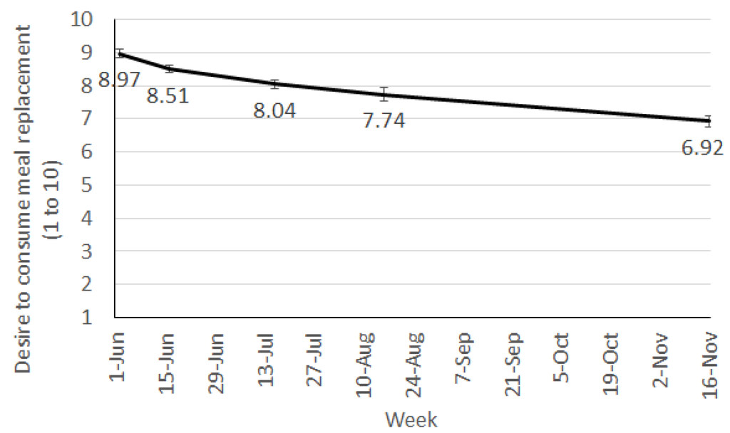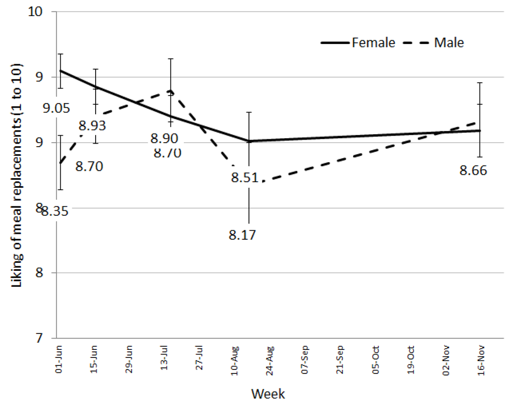 Week significantly affected desire to consume (F(4, 95.3) = 10.33, p < 0.001) and liking of MRs (F(4, 91.0) = 2.94, p = 0.025). The desire to continue having MRs fell throughout the 24 weeks and was significantly lower at week 24 compared to all other weeks (Figure 4). Liking remained relatively high through the 24 weeks (Figure 5). The significant interaction between week and sex (F(4, 91.0) = 2.94, p = 0.025) revealed that males and females had different liking patterns over time (Figure 5). Liking scores from females fell consistently from week 2 to week 24 with ratings of liking significantly lower by week 24. Males had a less clear pattern in ratings of liking over time with an initial peak, followed by a fall at week 12.