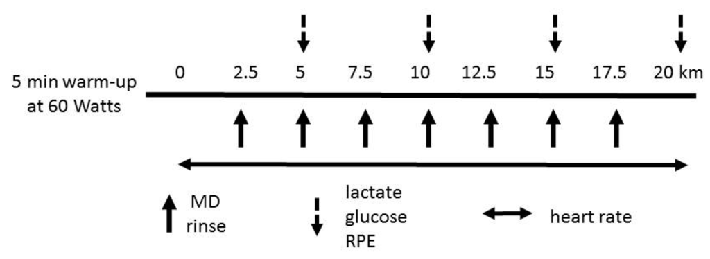 For the experimental trials, participants performed a warm up for 5 min at 60 W. After the warm up, participants cycled a 20 km distance as fast as possible with 2.5 kg (150 W) constant resistance. We decided on a 20 km time trial as preliminary work showed our participants to be able to complete approximately 20 km of distance in less than 1 h at 65% to 80% Wmax. Since a mechanically braked cycle ergometer (Monark Ergomedic 894E, Varberg, Sweden) was used in the present study, it was not possible to observe the completed amount of work instantly. Therefore, distance (20 km) and resistance (2.5 kg) were maintained constant to ensure that each participant performed an equal amount of work (i.e., 495 kJ). During the 20 km time trials, participants rinsed their mouth with different concentrations of MD solutions or placebo solution at 2.5, 5, 7.5, 10, 12.5, 15 and 17.5 km of the trial. The distance covered was displayed on the ergometer. Blood lactate, blood glucose and RPE were measured every 5 km of the trial. Heart rate was recorded every 5 s using short-range telemetry (Polar 810i, Polar Instruments, Kempele, Finland) throughout each trial. The time to complete each 5 km was recorded to calculate mean power output of each 5 km period. In the present study, we did not conduct a familiarization trial, but all participants were familiar to cycling. A schematic overview of the experimental protocol is shown in Figure 1.