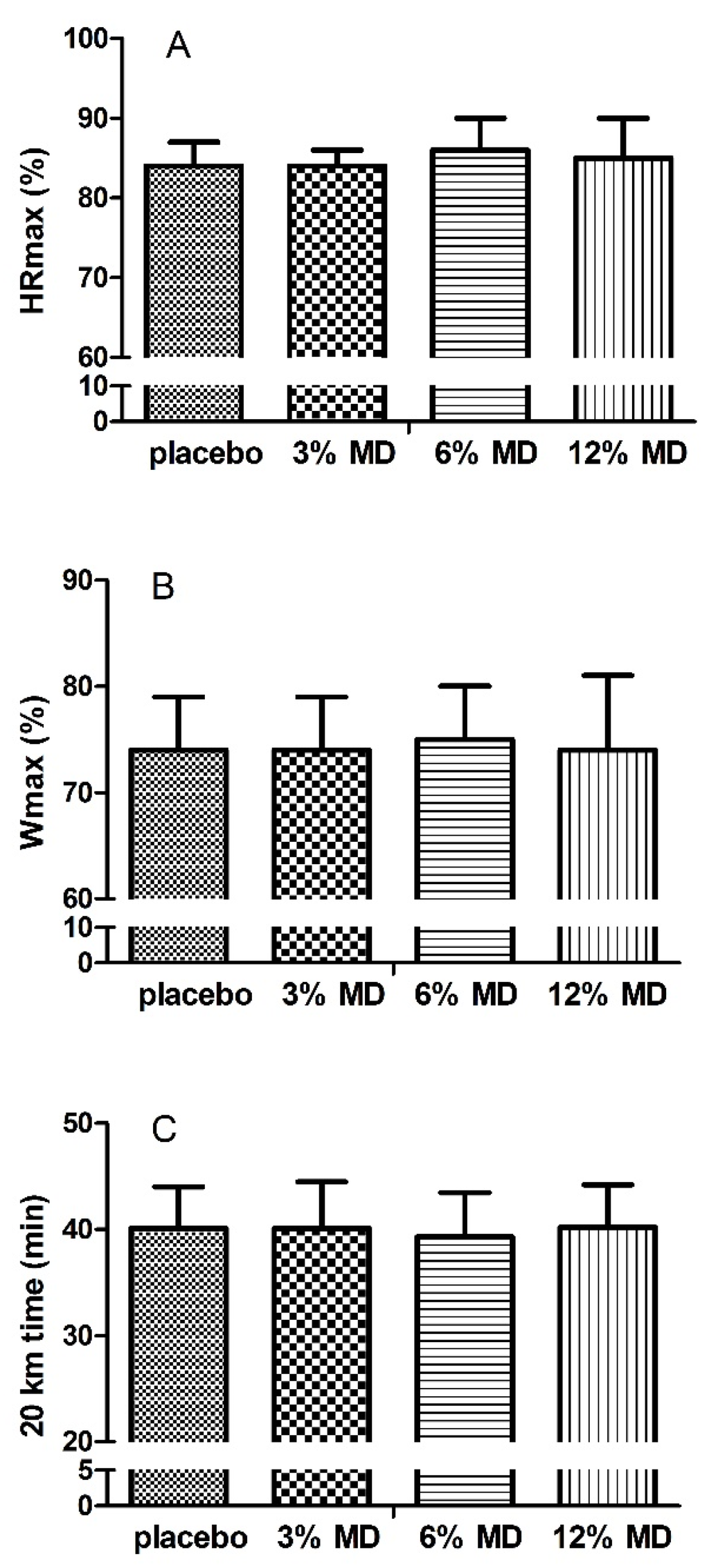 Percentages of HRmax (A); Wmax (B), achieved and 20 km time trial times (C). MD, maltodextrin. HRmax, maximum heart rate. Wmax, maximum cycling power.