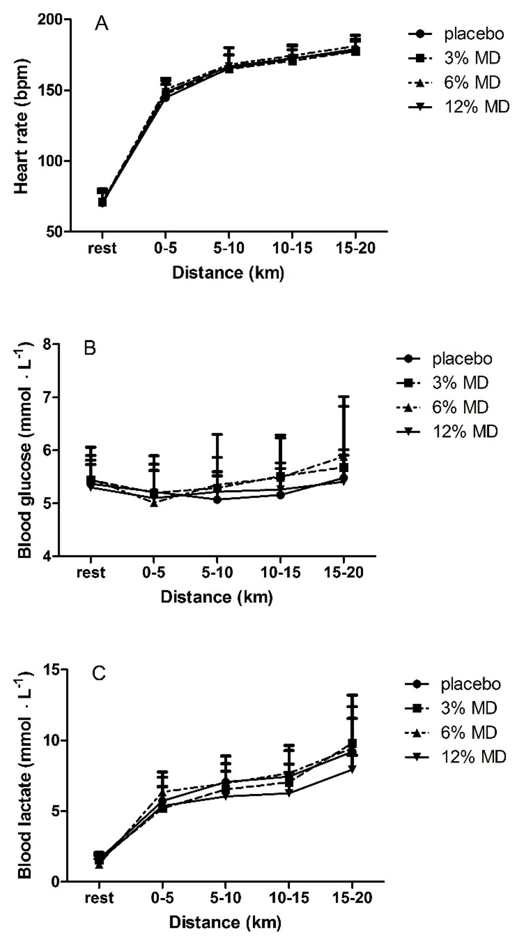 Heart rate (A); blood glucose (B); and blood lactate (C) as a function of cycled distance. MD, maltodextrin.