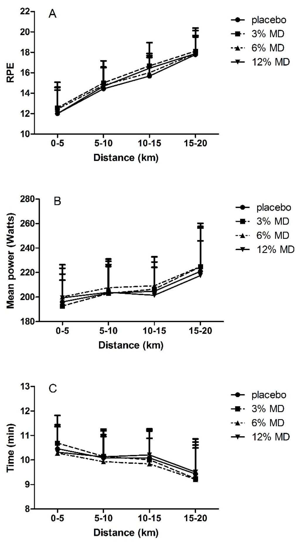 RPE (A), mean power (B); and time to complete distance intervals (C) as a function of cycled distance. MD, maltodextrin. RPE, rating of perceived exertion.