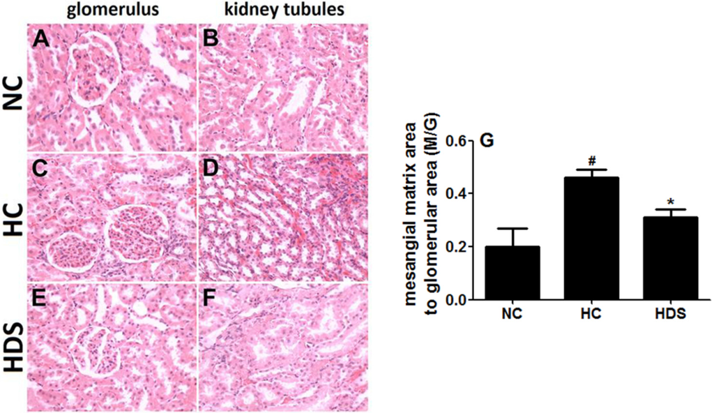 HE staining of renal tissues of rats in different groups. Glomerulus (left) and kidney tubule (right) tissues of rats in the NC group (A,B) HC group (C,D) and HDS group (E,F) (magnification ×400); (G) mesangial matrix area to glomerular area (M/G) ratio in different groups. # p < 0.05 compared with the NC group; * p < 0.05 compared with the HC group.