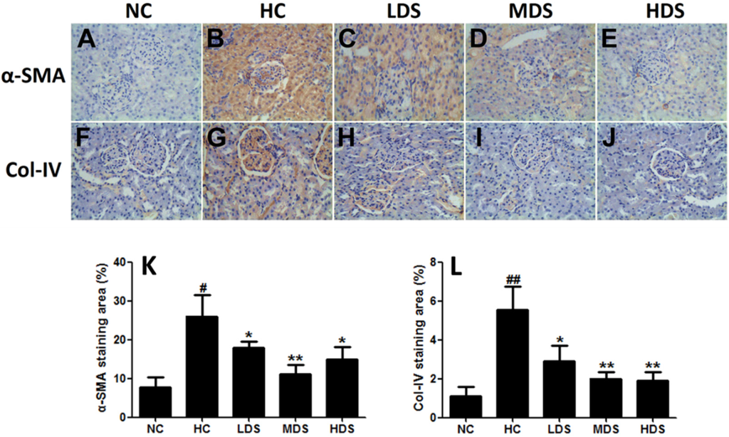 Immunohistochemical staining of α-SMA (A–E) and Col-IV (F,G) expression of renal sections in the NC group (A,F) HC group (B,G) LDS group (C,H) MDS group (D,I) and HDS group (E,J) (magnification ×400). Quantification of α-SMA (K) and Col-IV (L) staining, evaluated with Image-Pro Plus software (Media Cybernetics, Silver Springs, MD, USA). # p < 0.05, ## p < 0.05 compared with the NC group; * p < 0.05, ** p < 0.01 compared with the HC group.
