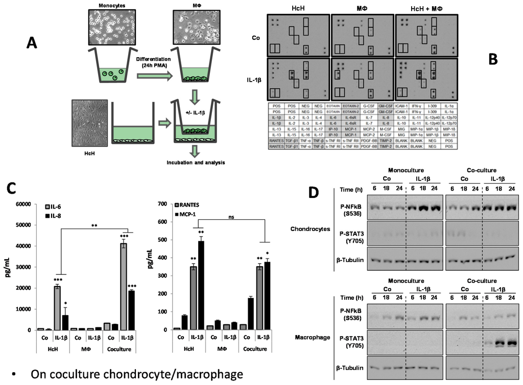 Characterization of inflammation in chondrocyte/macrophage coculture model. (A) Scheme of coculture model device and morphology of the grown cells as seen by contrast phase optical microscopy. HcH: Human chondrocytes. MΦ: Macrophages; (B) Representation of antibody-array screening of cytokines, 24 h after IL-1β treatment (IL-1β) or not (Co) on primary human chondrocytes (HcH) alone, Thp1-derived macrophages (MΦ) alone or in our coculture system with both HcH and MΦ. Table above shows the antibody array representing anti-cytokines antibody emplacement; (C) ELISA determination of the levels of IL-6, IL-8, Rantes, MCP-1 in HcH, MΦ cultures or in HcH/MΦ coculture. Effect of IL-1β treatment. Pg/mL: picogram/mL. *, p-value ≤ 0.05; **, p-value ≤ 0.01; ***, p-value ≤ 0.001. Statistical analysis: data are the means ± SEM of three different experiments and assays in triplicate. Differences between groups were analyzed by one-way analysis of variance (ANOVA); (D) Western blot assessment of the level of phosphorylated NFκB (p-NFκB) and p-STAT3 in chondrocytes and in macrophages. Influence of the monocultures and coculture conditions. Β-Tubulin was used as the control of protein loading. Concerning STAT3 phosphorylated changes, we assumed the level of un-phosphorylated STAT3 was unchanged since we have seen no changes in its level in Figure 2B and Figure 5B. For NF-κB, we titrated the amount of phospho-NF-κB with a specific phospho antibody, but so far we have no indication on the molecular mechanism of interconversion between unphosphorylated and phosphorylated forms.