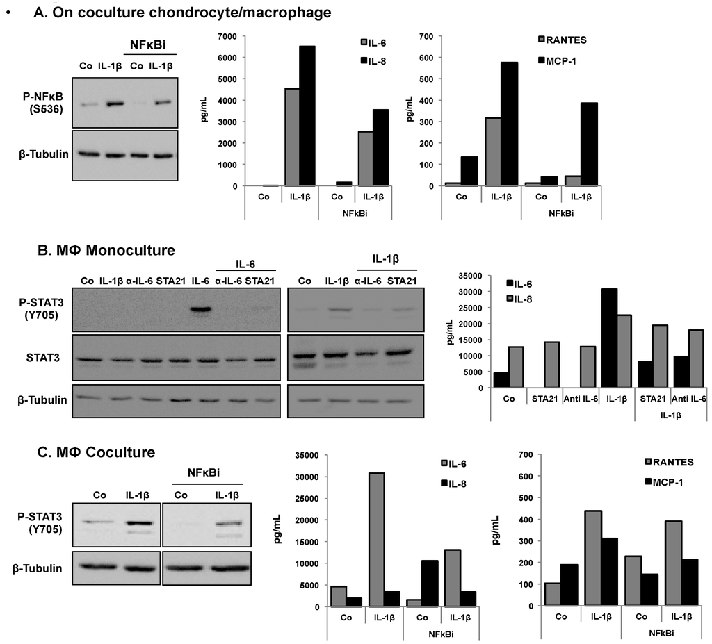 This strongly suggests that paracrine interactions between chondrocytes and macrophages were taking place. To confirm this hypothesis, we tested the effect of different inhibitors of phosphorylation of p-NF-κB and p-STAT3, in addition to the measurement of secretion levels of IL-6, IL-8, Rantes and MCP-1 (Figure 2). Indeed, the NF-κB inhibitor (NF-κBi) decreased both p-NF-κB and cytokine levels following IL-1β stimulation (Figure 2A). Figure 2B shows a decrease of the p-STAT3 level and of IL-6, and of IL-8 production in IL-1β-stimulated macrophages in monoculture treated with STA21 (STAT3 inhibitor), anti-IL-6 antibody and alpha IL-6. Figure 2C indicates that for macrophages in coculture, the level of p-STAT3 decreased in the presence of the NF-κB inhibitor (NF-κBi) coculture. Accordingly, there was also a decrease of the levels of IL-6, IL-8, Rantes and MCP-1.