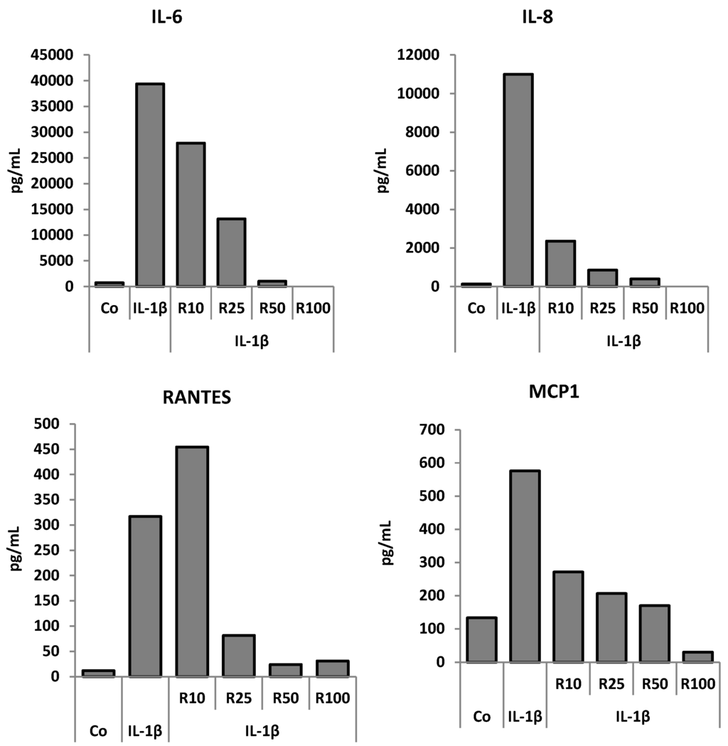 Resveratrol effects on the levels of secreted IL-6, IL-8, Rantes and MCP-1 in HcH monoculture and influence of the IL-1β treatment. Representative data from one of three experiments are shown. ELISA assessment of the levels of IL-6, IL-8, Rantes, MCP-1 in culture medium. Co: control. Resveratrol (R) in μM. Pg/mL: picogram/mL.