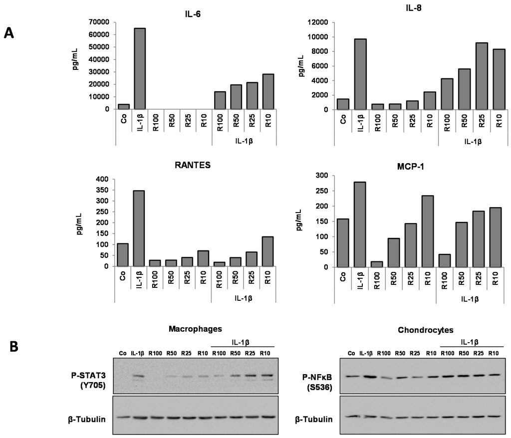 Resveratrol effect on the expression levels of IL-6, IL-8, Rantes, MCP-1 and on the expression of p-NF-κB and p-STAT3 in HcH and MΦ cocultures and influence of the IL-1β treatment. (A) ELISA estimation of the level of IL-6, IL-8, Rantes, MCP-1 in culture medium. Representative data from one of three experiments are shown; (B) Western blotting assessment of the expression of p-STAT3 in HcH and MΦ cocultures. β-Tubulin: protein loading control, Co: control. Resveratrol (R) in μM. Pg/mL: picogram/mL. Representative data from one of three experiments are shown.