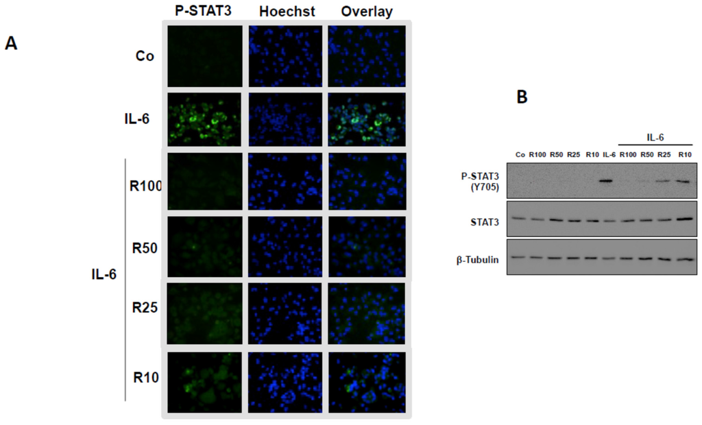 Resveratrol effects on the levels of STAT3 phosphorylation in macrophage monoculture. (A) Fluorescence microscopy analysis of STAT3 phosphorylation (green labeling). Resveratrol (100 or 50, 25 or 10 μM) limits the IL-6-induced STAT3 phosphorylation level (decrease of green labeling). Cell nuclei were labeled with Hoechst dye. The overlay confirms the nuclear location of p-STAT3. Representative data from one of three experiments are shown; (B) Western blotting analysis of STAT3 phospholylation. Resveratrol limits the IL-1β-induced STAT3 phospholylation. β-Tubulin: protein loading control; Co, control. Representative data from one of three experiments are shown.