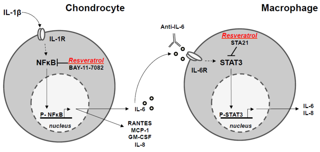 Concerning resveratrol, this natural compound displays strong inhibitory effects on pro-inflammatory marker secretion. The decrease of IL-6 secretion by resveratrol was dependent on NF-κB inhibition in chondrocytes. Such a reduced IL-6 level downregulates STAT3 activation in macrophages, leading to the impairment of the running inflammatory amplification loop (Figure 6).