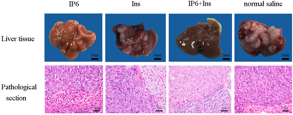 Mouse livers were dissected at the end of the experiment, and different-sized nodules were found to be distributed on their surfaces (Figure 1). Pathological biopsy confirmed that the liver nodules were poorly differentiated adenocarcinomas. In the control group, the tumor volume was large and covered the entire liver; in the Ins group, the tumor volume and distribution were reduced; in the IP6 group, the tumor volume was small, but the tumor distribution was broad; and in the IP6 + Ins group, the tumor volume was the smallest, and the tumors were concentrated in liver blood vessels. Pathological sections revealed that tumor cells were loosely arranged, with various shapes and sizes, hyperchromatic nuclei and nuclear fission, and they displayed increased nucleocytoplasmic ratios. In the IP6 group and Ins group, intense nuclear staining was detected. In contrast, in the IP6 + Ins group, weak nuclear staining was observed. In the control group, the nuclei appeared hyperchromatic, and the nucleocytoplasmic ratio was increased. The pathological sections of the poorly differentiated liver adenocarcinomas demonstrated the success of the mouse model, and mice lacking liver metastasis due to surgical failure or other reasons were excluded from the experiment. Table 2 shows the number of mice used, the tumor weights and the tumor inhibition rates. Compared with the control group, the IP6, Ins, and IP6 + Ins groups exhibited significantly reduced tumor weights, and the greatest effect was observed in the IP6 + Ins group. Relative to the control group, the tumor inhibition rates of the IP6, Ins, and IP6 + Ins groups were 53.52%, 52.15%, and 72.59%, respectively. Statistical analysis revealed that administration of IP6 or Ins significantly reduced the development and metastatic progression of CRC to the liver in the BALB/c mice and that the IP6 + Ins treatment had significantly greater effects than the other treatments.