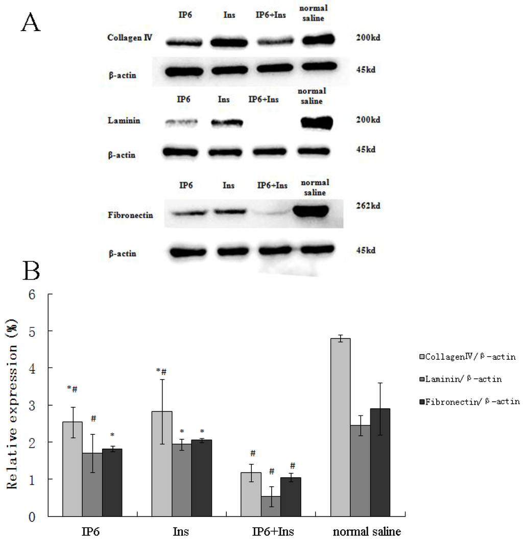 Western blot analysis of the effects of IP6, Ins, IP6 + Ins and normal saline on the levels of collagen IV, Lamininand Fibronectin. IP6 or Ins treatment decreased the protein expression of collagen IV, LN and FN, and the combined IP6 + Ins treatment resulted in significantly greater effects compared with treatment with either compound alone. The samples were probed with antibodies against p-collagen IV, p-LN, and p-FN. The Western blot membranes were stripped and reprobed for β-actin as an internal control to confirm equal loading. (A) representative blots from one of three separate experiments; (B) relative band intensities based on densitometry. The results are expressed as the mean ± standard deviation from three independent experiments. * p < 0.05 compared to the IP6 + Ins group; # p < 0.05 compared to the normal saline group.