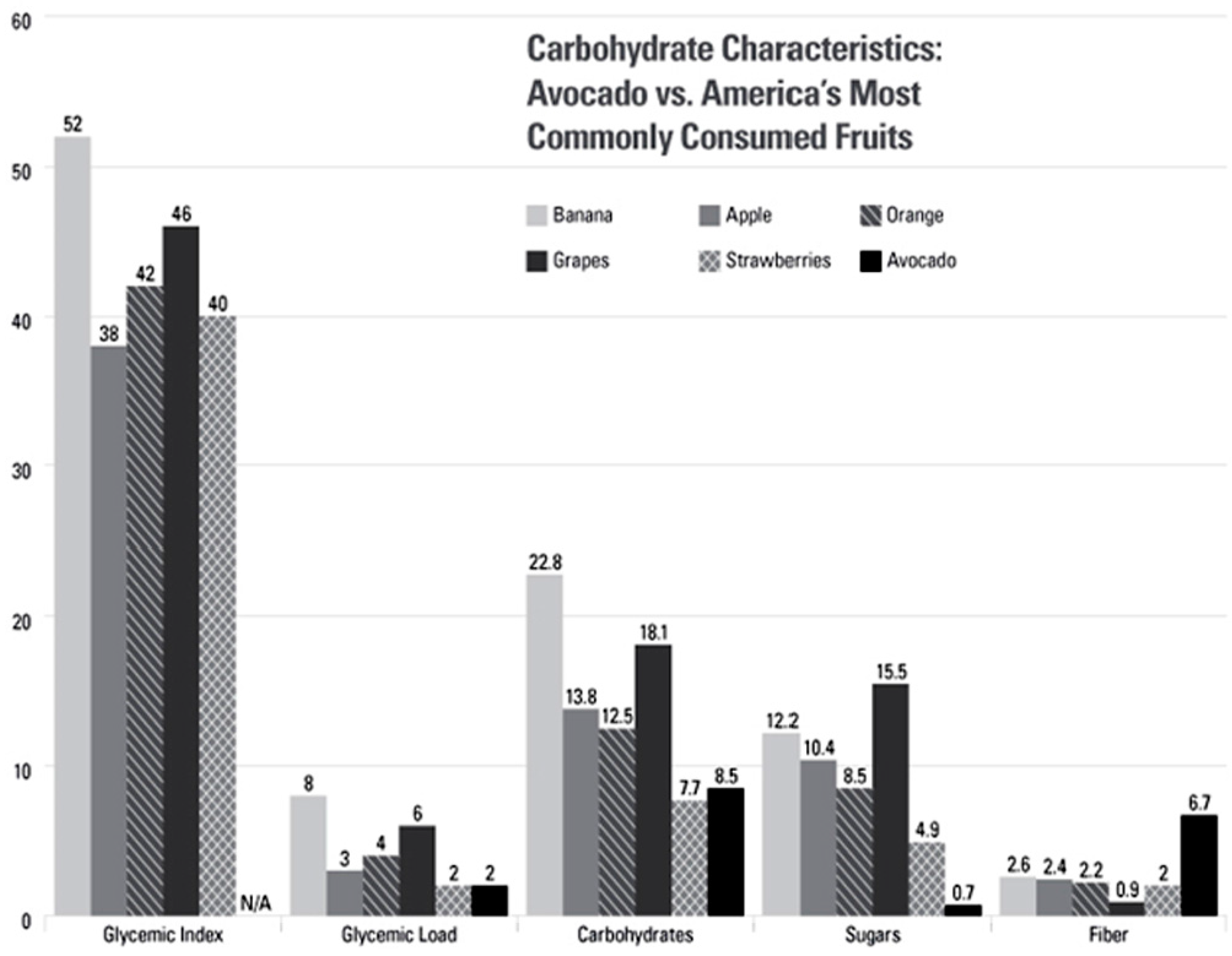 Carbohydrate Characteristics: Avocado vs. America’s Most Commonly Consumed Fruits. Glycemic Index Scale: Glucose = 100. Carbohydrates, sugars, and fiber are all listed per 100 g serving. There are no glycemic index values given for avocados because they contain so few carbohydrates that it would be difficult for people to consume a large enough portion (50 g of available carbohydrates) to properly perform glycemic index testing. Data sources: Nutrients—USDA Nutrient Database for Standard Reference 27 [47,48]; Glycemic Load and Glycemic Index—International table of glycemic index and glycemic load values [49].