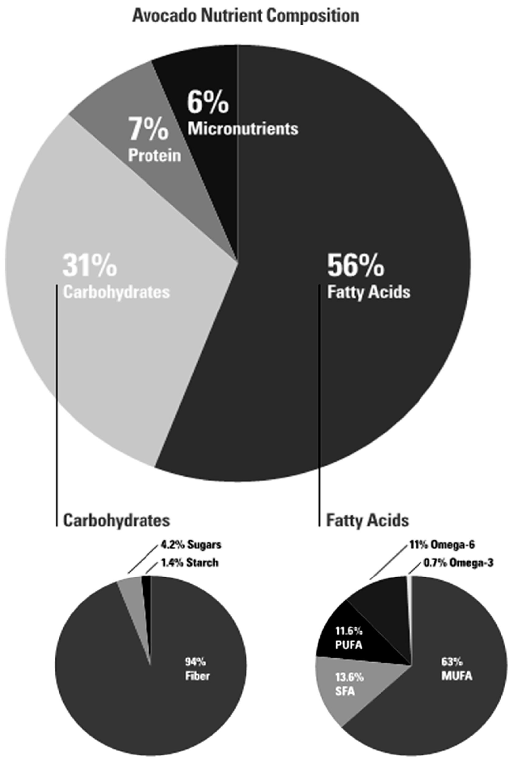 According to the Continuing Survey of Food Intakes by Individuals (CSFII), the most common sources of MUFA, not including breast milk, in children ages zero to two years old are cow’s milk, peanut butter, white potato/French fries, hot dogs, eggs, chicken nuggets, corn puffs, and macaroni with cheese [124]. All of these sources, except peanut butter, have higher levels of SFA and/or starchy carbohydrates, than they do MUFA. In comparison, oil-containing fruits such as avocados have much higher levels of MUFA than any other fatty acids, and they also contain more fiber than starch, making them an optimal source of MUFA with likely no nutritional components associated with high cholesterol levels and insulin resistance (Figure 2). Rather, they have multiple nutritional components that research shows are inversely associated with the risk factors involved in the development of cardiovascular disease and metabolic syndrome [124,125,126].