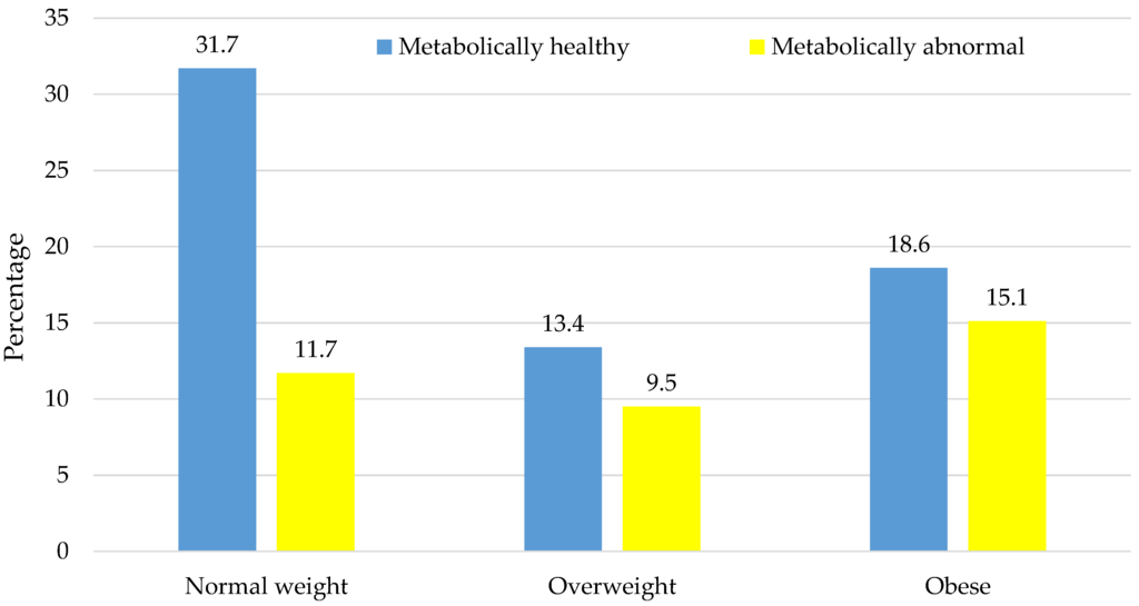 Participants were then classified for metabolic status as “metabolically healthy” if they had none or one metabolic abnormality, and as “metabolically abnormal” if they had two or more metabolic abnormalities. Cross-classification of participants by BMI and metabolic status led to the following six phenotypes: (1) normal weight and metabolically healthy (NWMH); (2) normal weight and metabolically abnormal (NWMA); (3) overweight and metabolically healthy (OvMH); (4) overweight and metabolically abnormal (OvMA); (5) obese and metabolically healthy (OMH); and (6) obese and metabolically abnormal (OMA).
