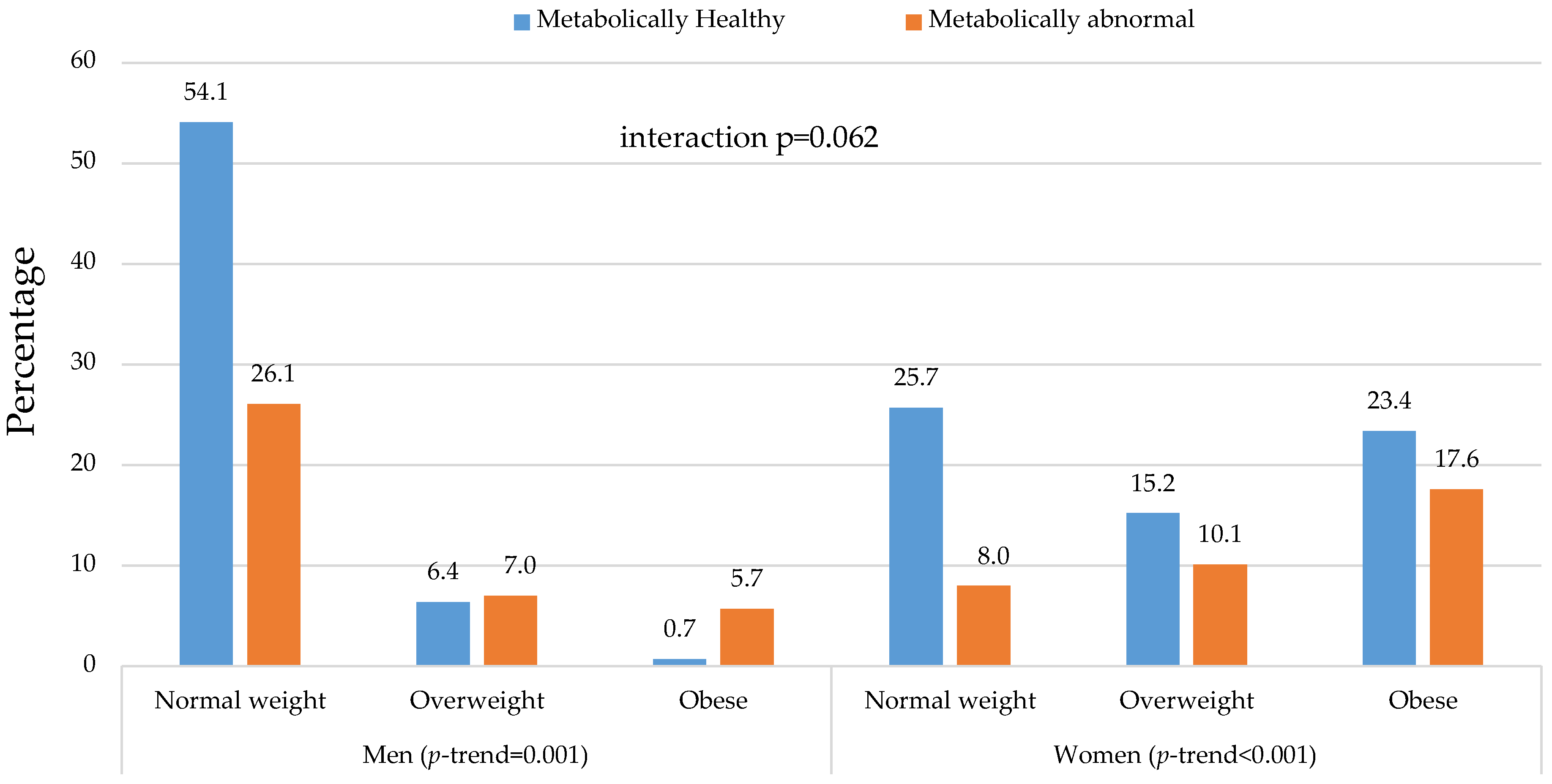 Distribution of metabolic phenotypes across body mass index categories in men and women. Each vertical bar represents the proportion of participants in the total gender-specific sub-sample with the corresponding combination of body size (normal-weight, overweight, or obese) and metabolic phenotype (healthy or abnormal). The accompanying gender-specific proportions are shown at the tip of each bar. The p-value for the interaction by gender in the distribution are shown, together with the p-value for le linear trend (p-trend) in the distribution of metabolic phenotypes across body mass index categories, seperately in men and women.